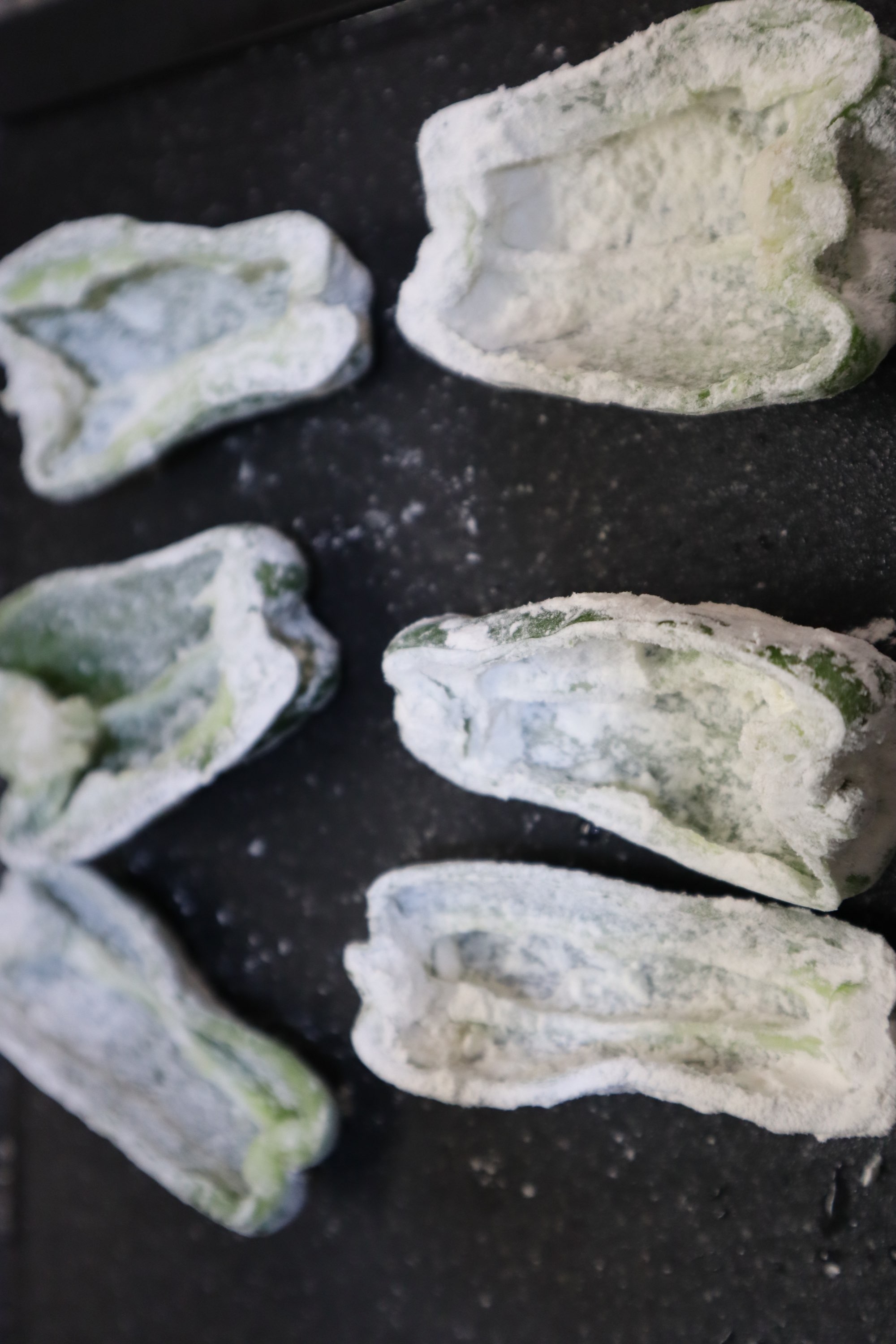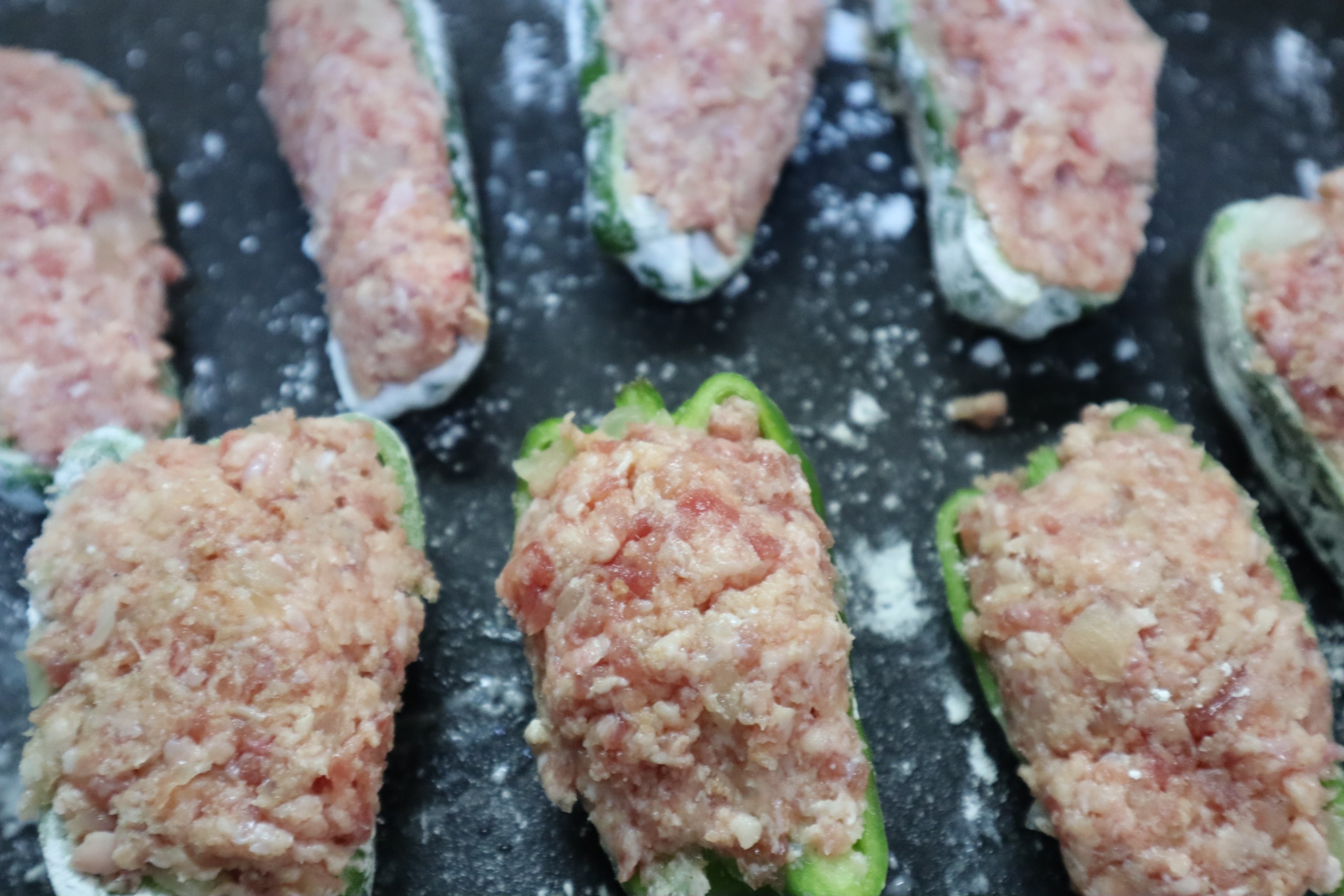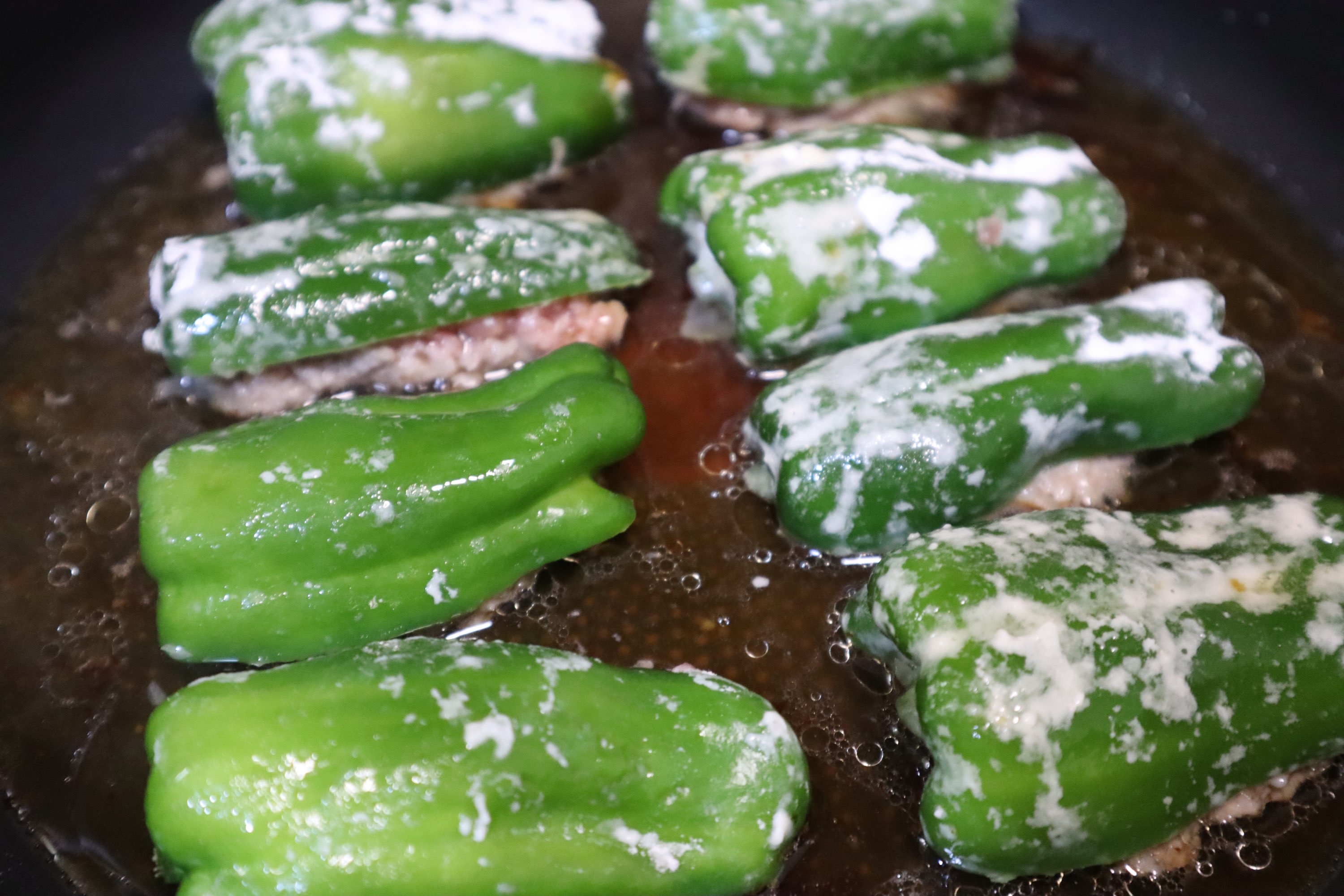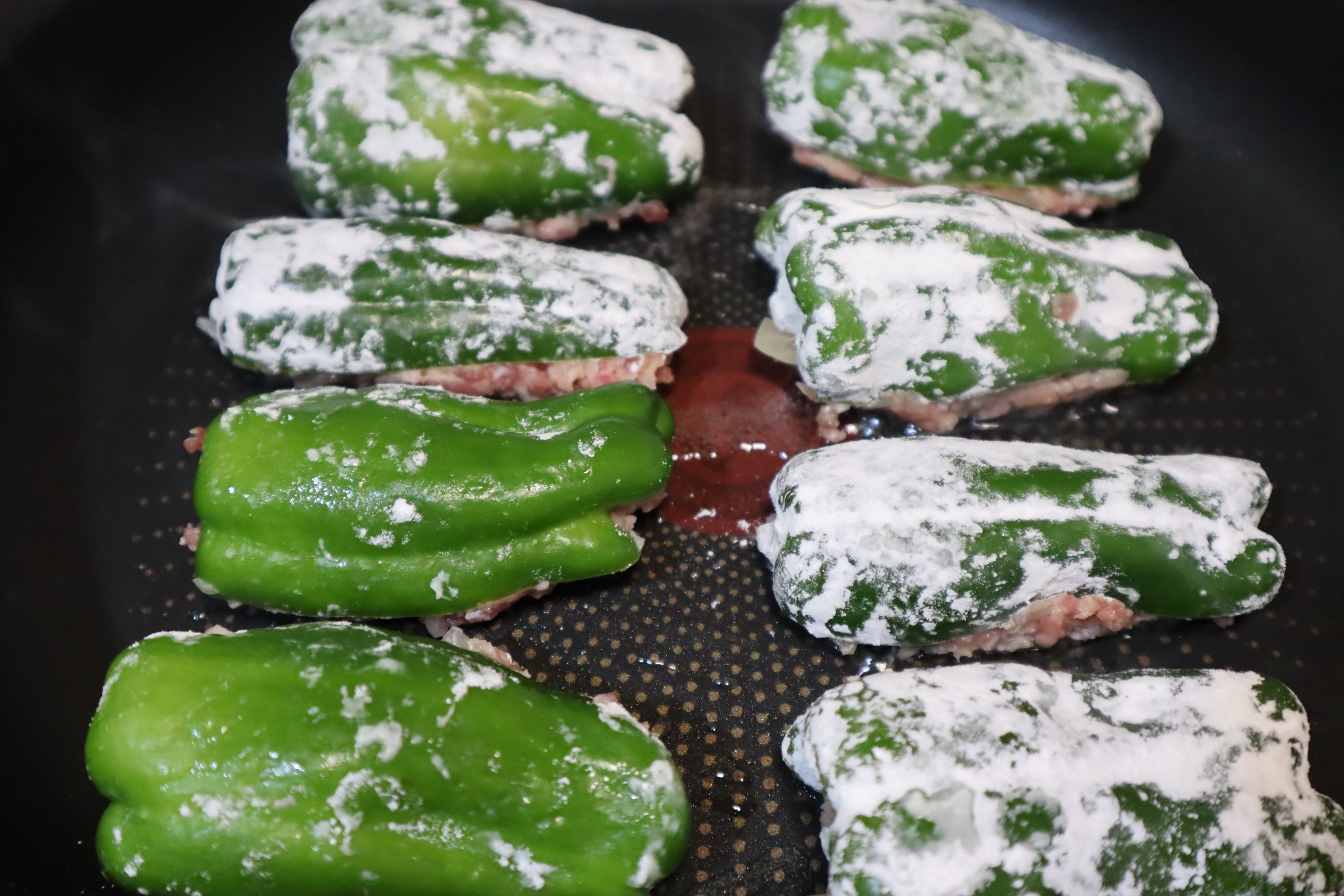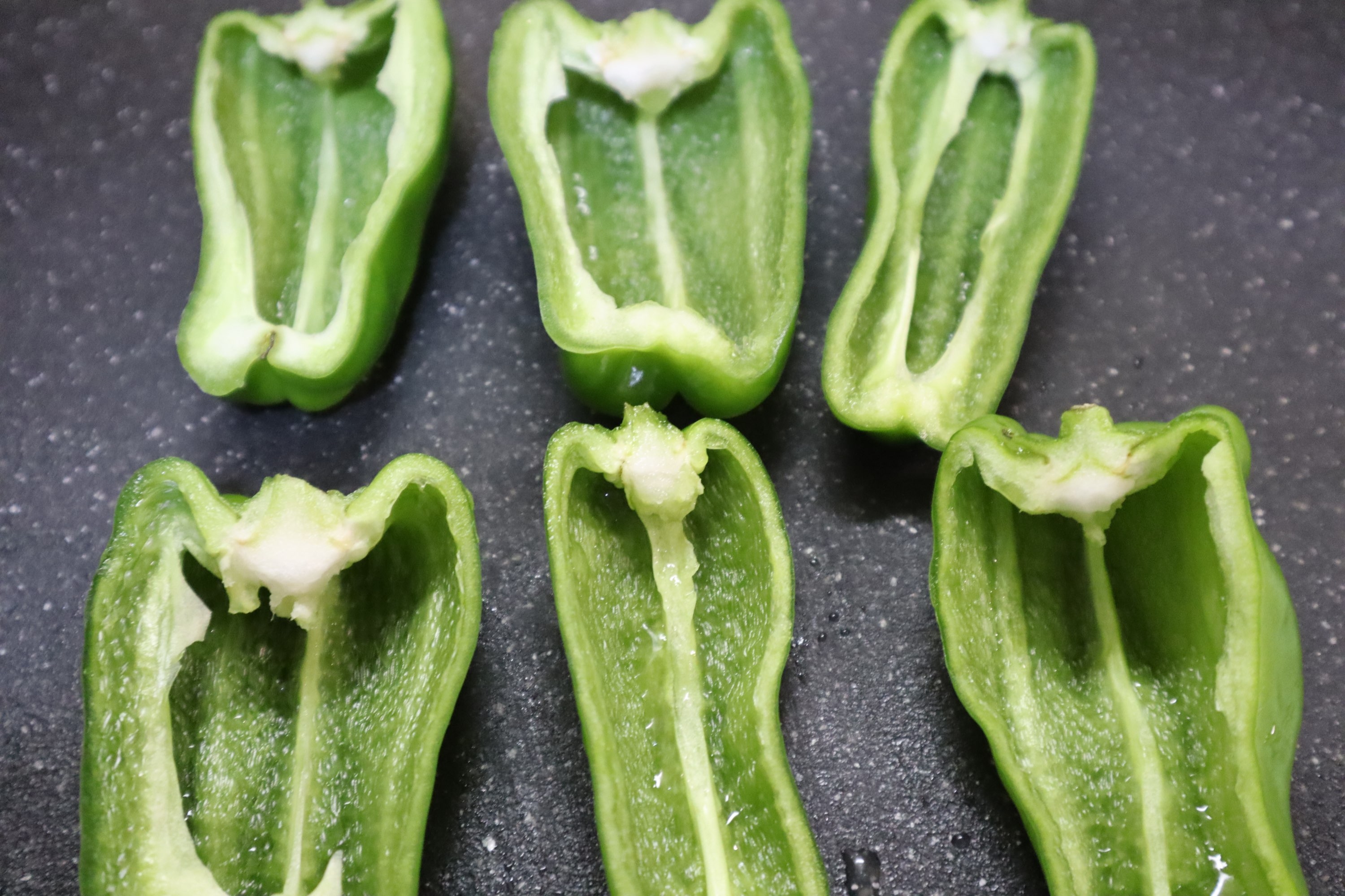 ピーマンに①を隙間なく詰めます。上にこんもりする位のせてOKです!