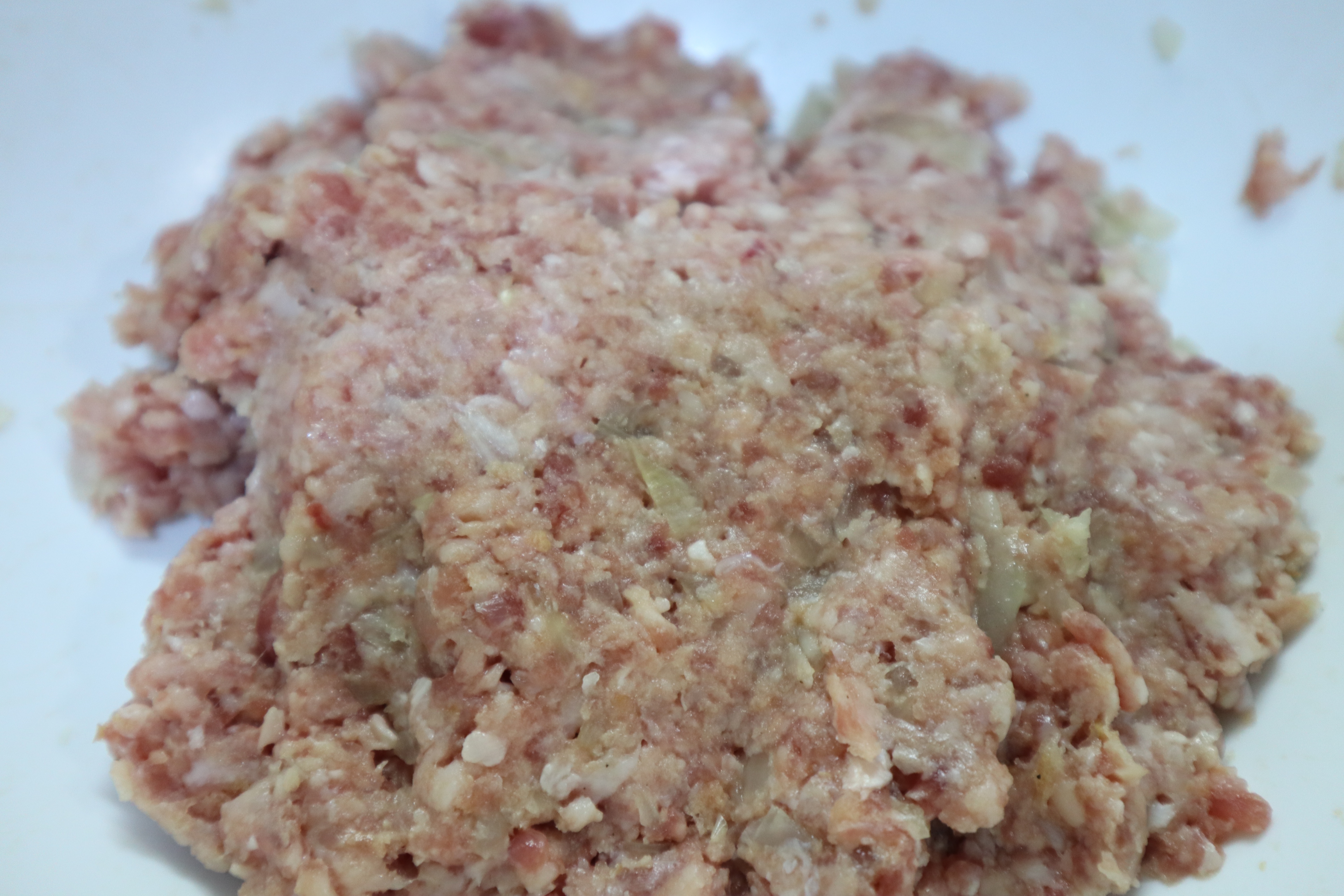 ボールにひき肉・みじん切りにした玉ねぎ・パン粉・牛乳・卵を入れて、よく混ぜます。