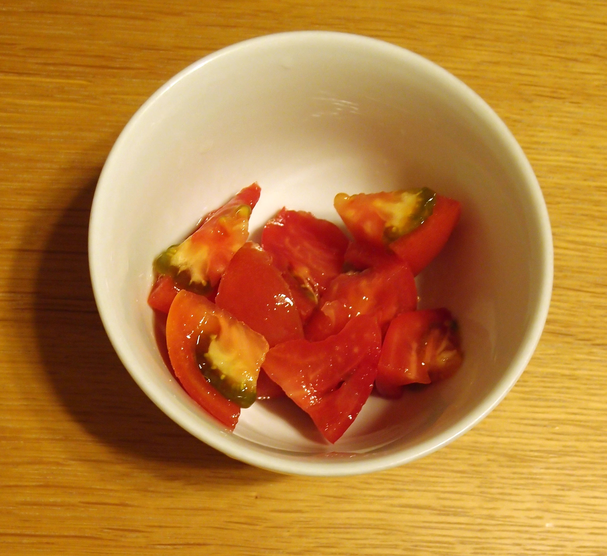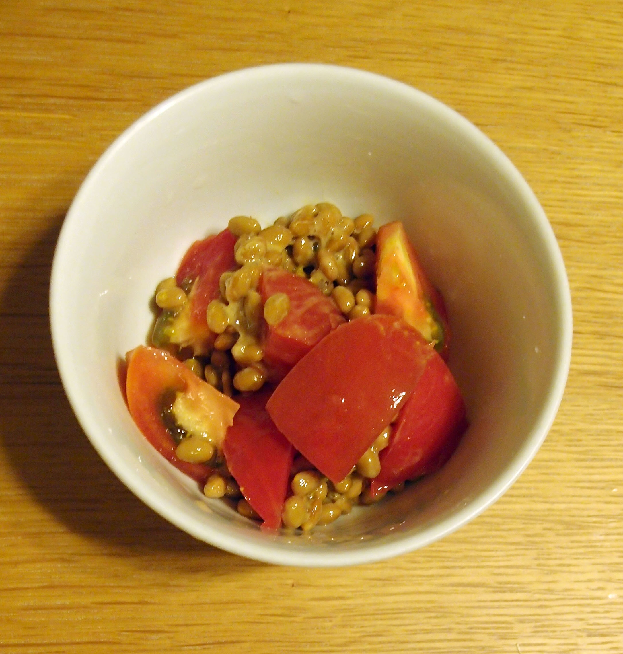 朝食にトマトの納豆、トマトで納豆がさっぱりいただけとてもおいしかったです♥️
