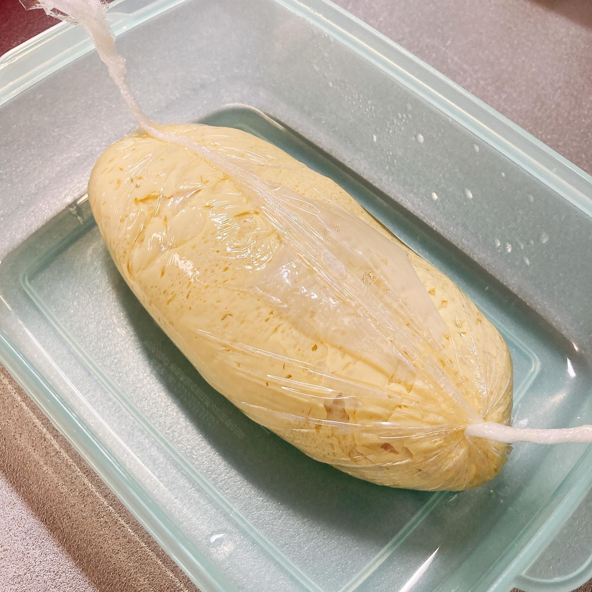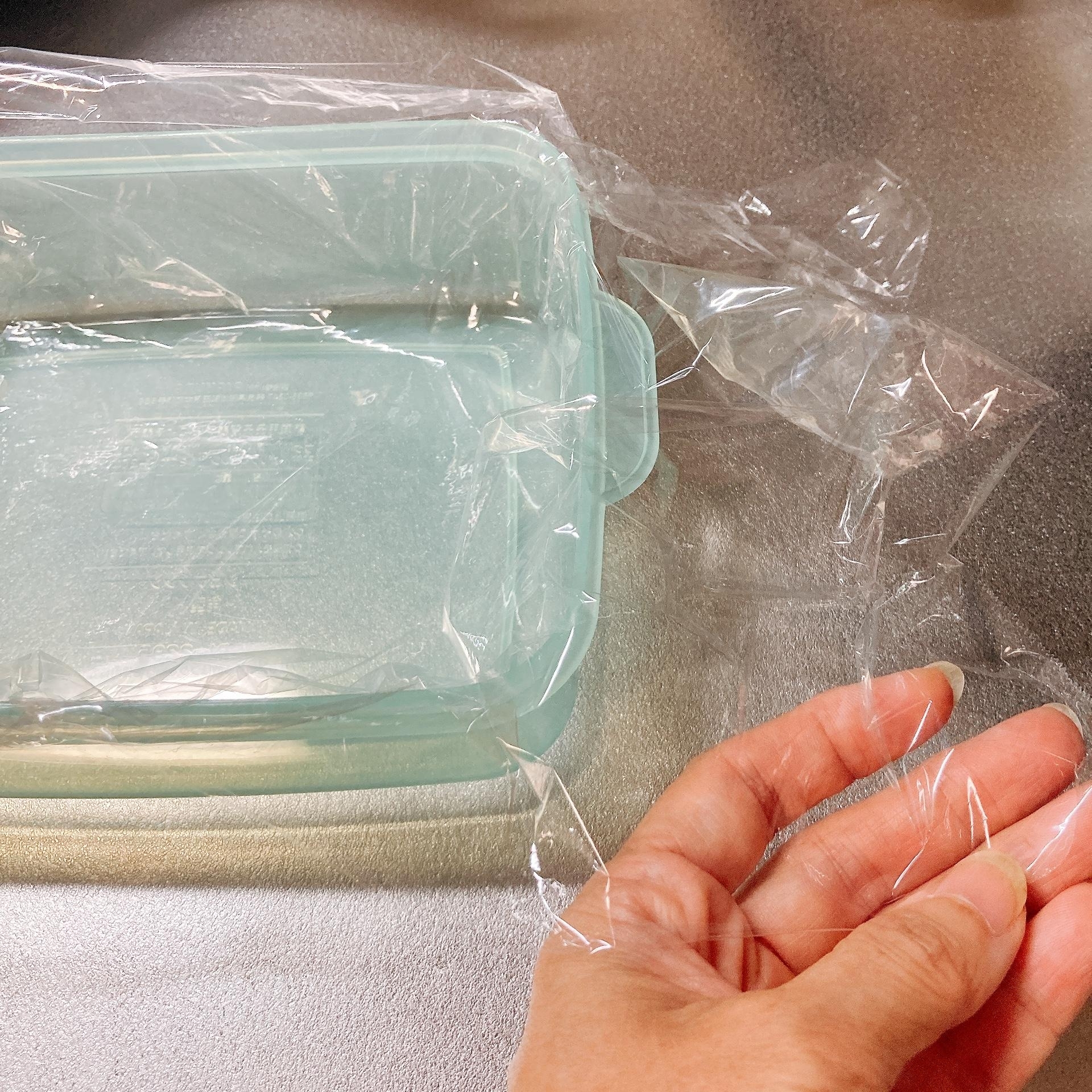 耐熱容器にラップを敷く。(後で卵を包むことを考え、大きめに敷いておくといいですよ)