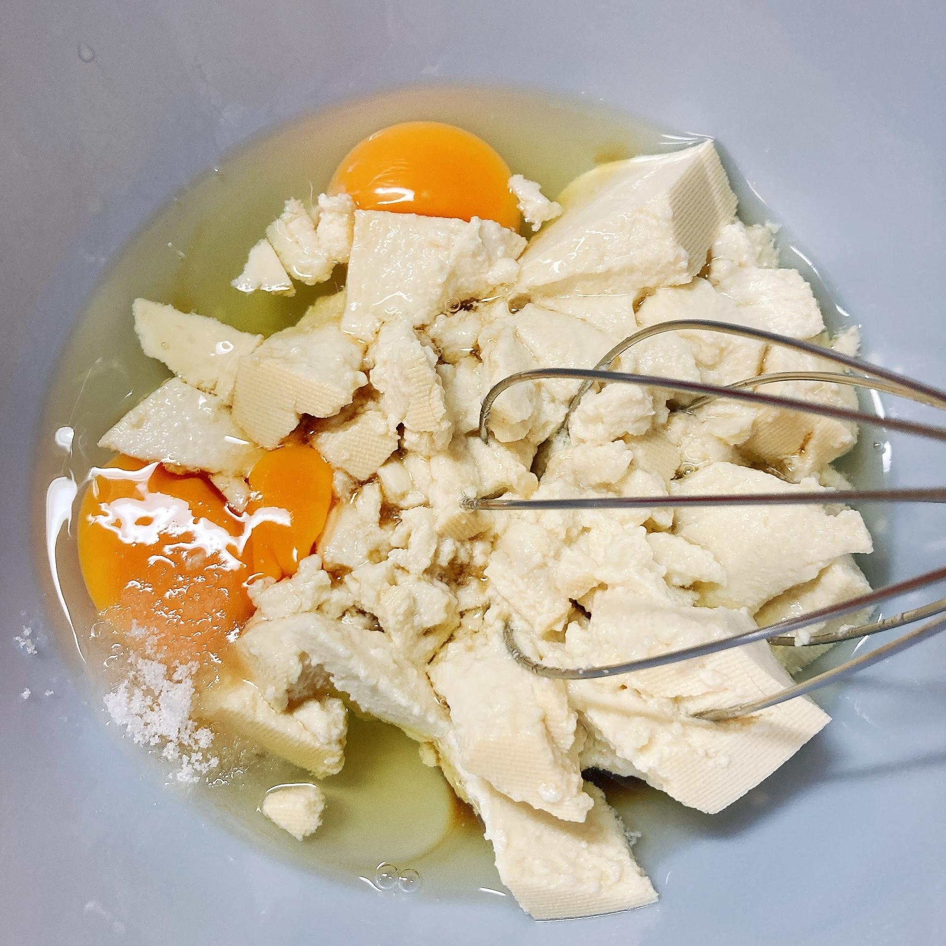 ボウルに材料を全部入れ、泡立て器でよく混ぜる。