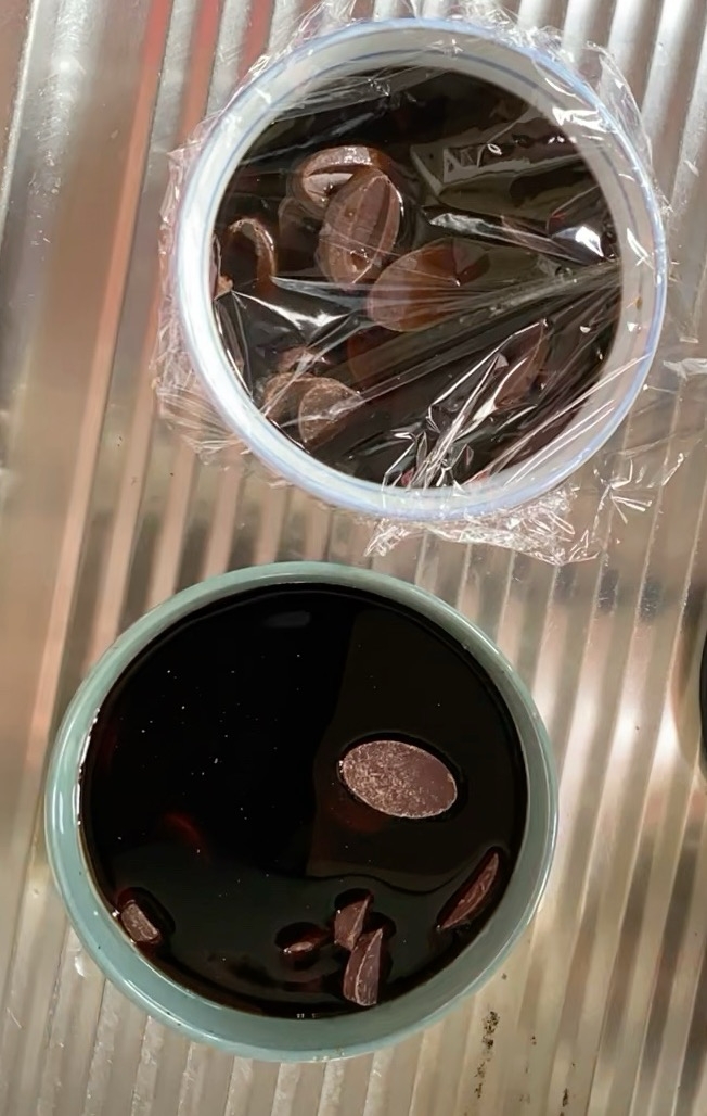ヴァローナカライブとアイスネスカフェを耐熱性容器に入れてラップをして、600Wのレンジで30秒×4回かけて温めて溶かして泡立て器で混ぜます