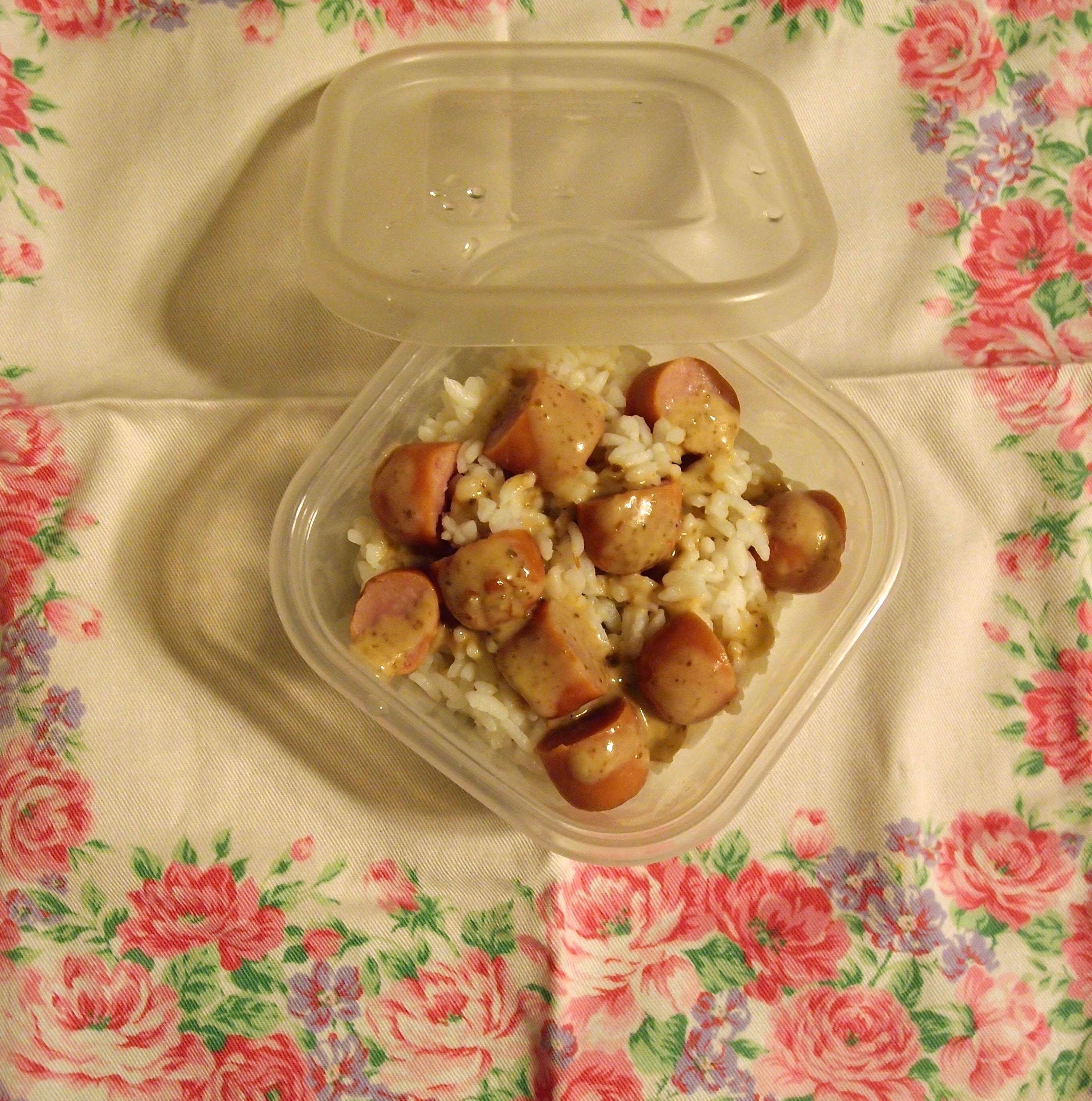- 5 温かいご飯を器に入れ、その上に練り胡麻マヨソースを絡めたウィンナーをのせます