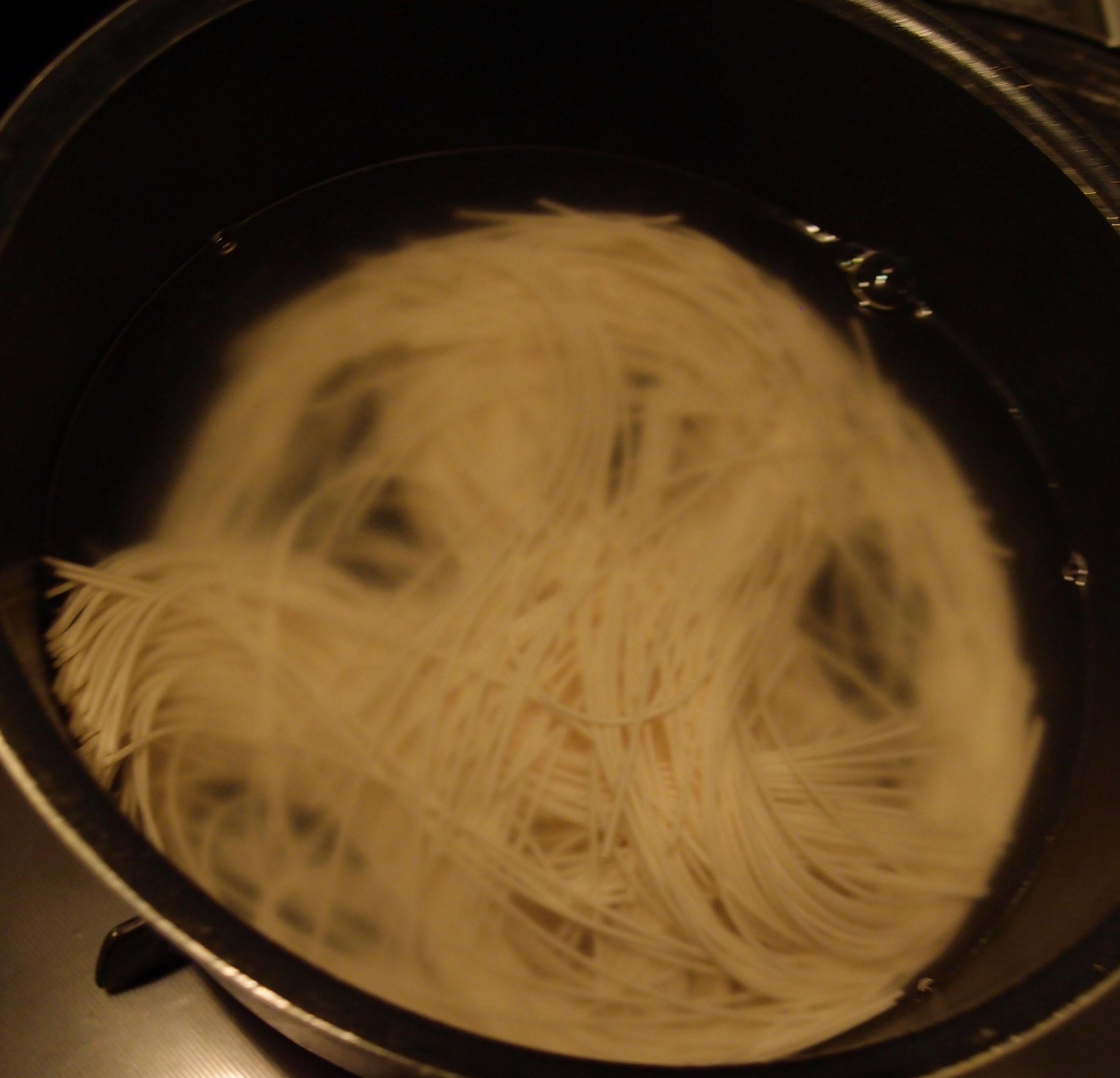 お鍋に水を入れて中火にかけ、沸騰したら、素麺を入れて菜箸で混ぜながら2分程度茹で、火を消して、蓋をして余熱で2分加熱します