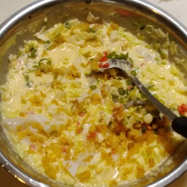 混ざったら、キャベツ・青ネギ・バナメイエビ・冷凍カットイカ・紅生姜・天かす・ちくわを入れてよく混ぜます