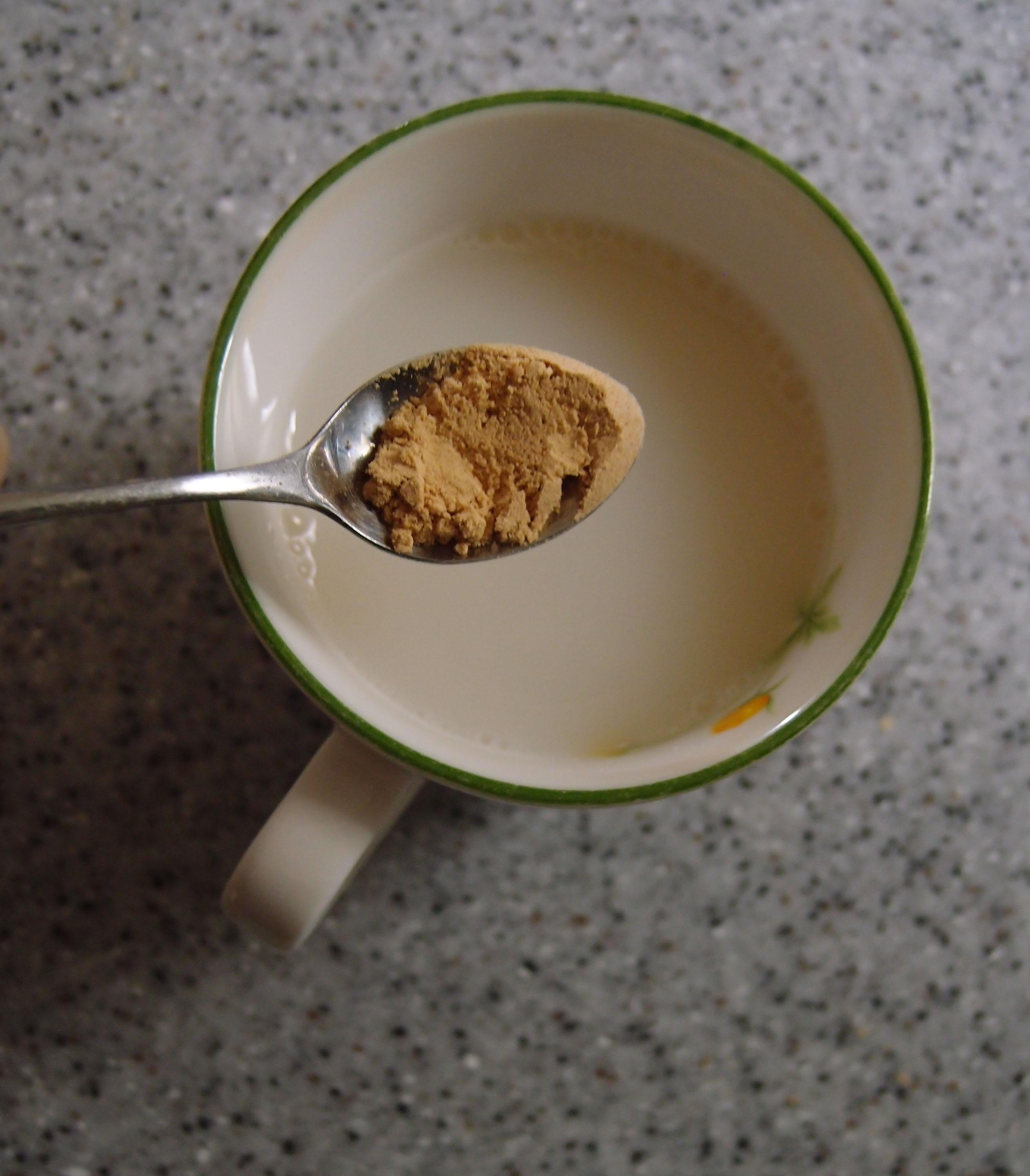 牛乳をカップに入れ、きな粉を加えてよく混ぜます