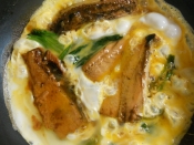 半熟程度で火からおろして温かいご飯の上に盛りつけます。