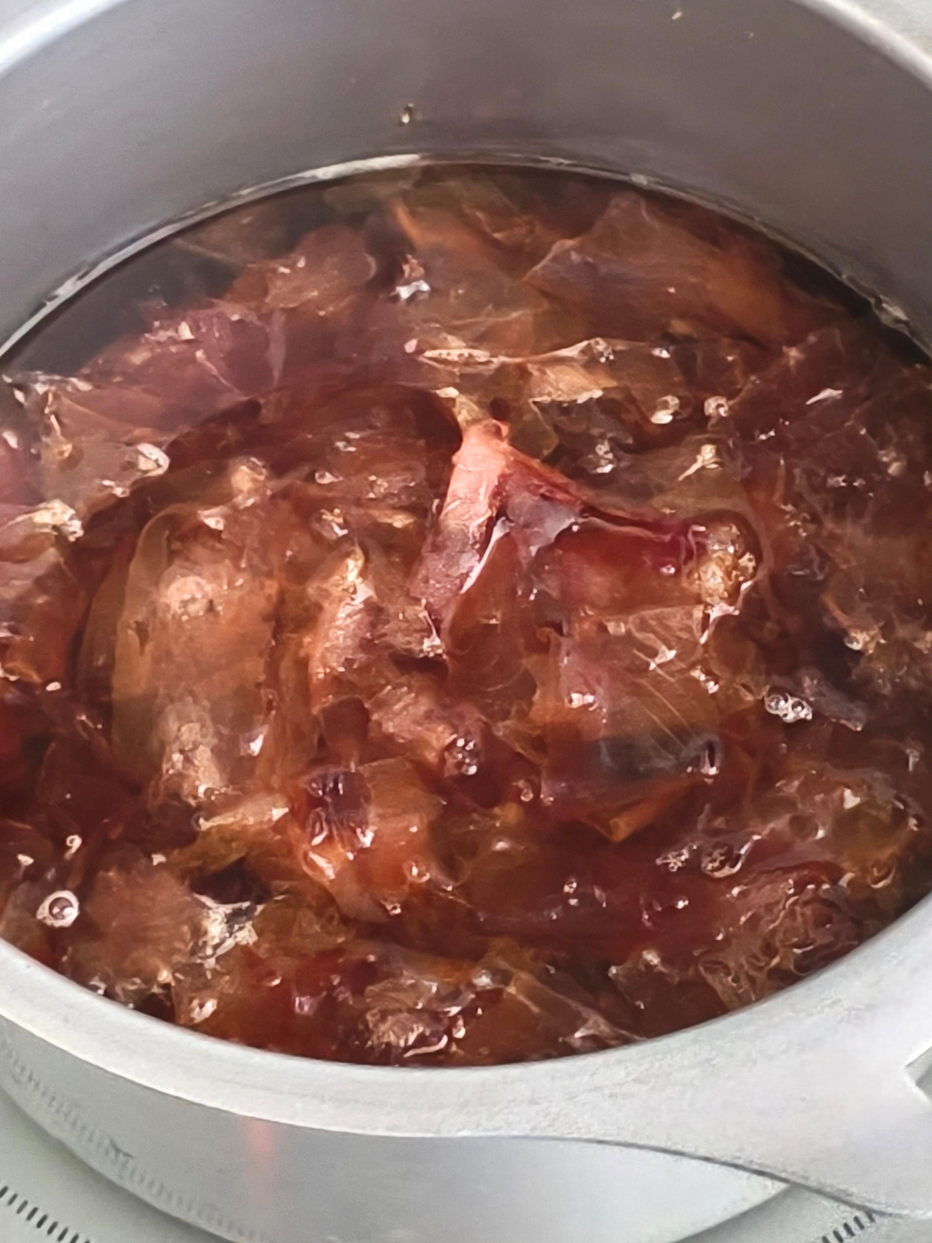 ⑪が熱いうちに唐辛子を入れて漬け込み液を冷まします。