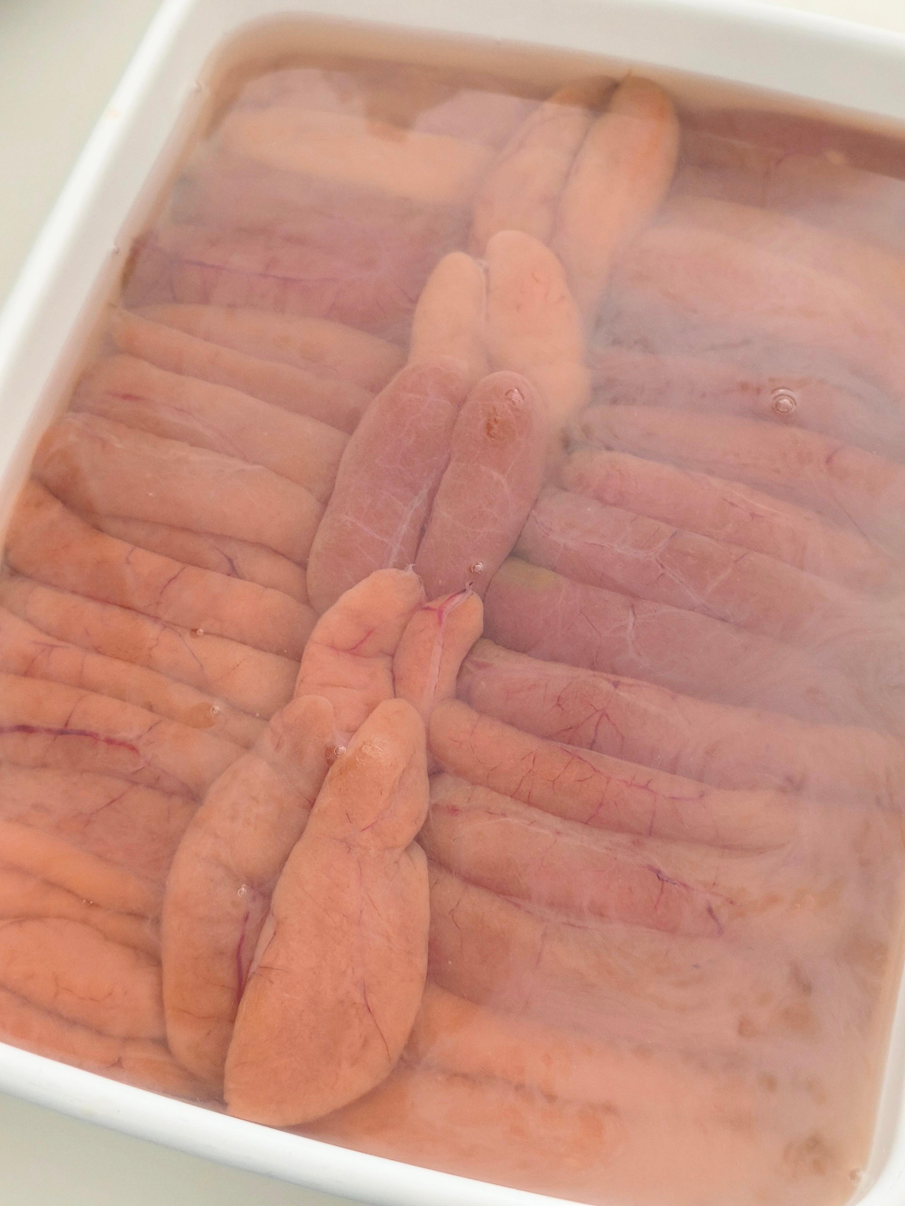 針などで血管を刺しておいて、しばらくしてぼらこがふっくらしてきたら、余分な膜を切り落としたり包丁の背などでやさしくしごいて血液をだしてきれいにしていきます。