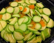 大きくて深いフライパンに先程の韓国南瓜を入れます。人参はヘタを取ったらスライサーで直にスライスしていきます。