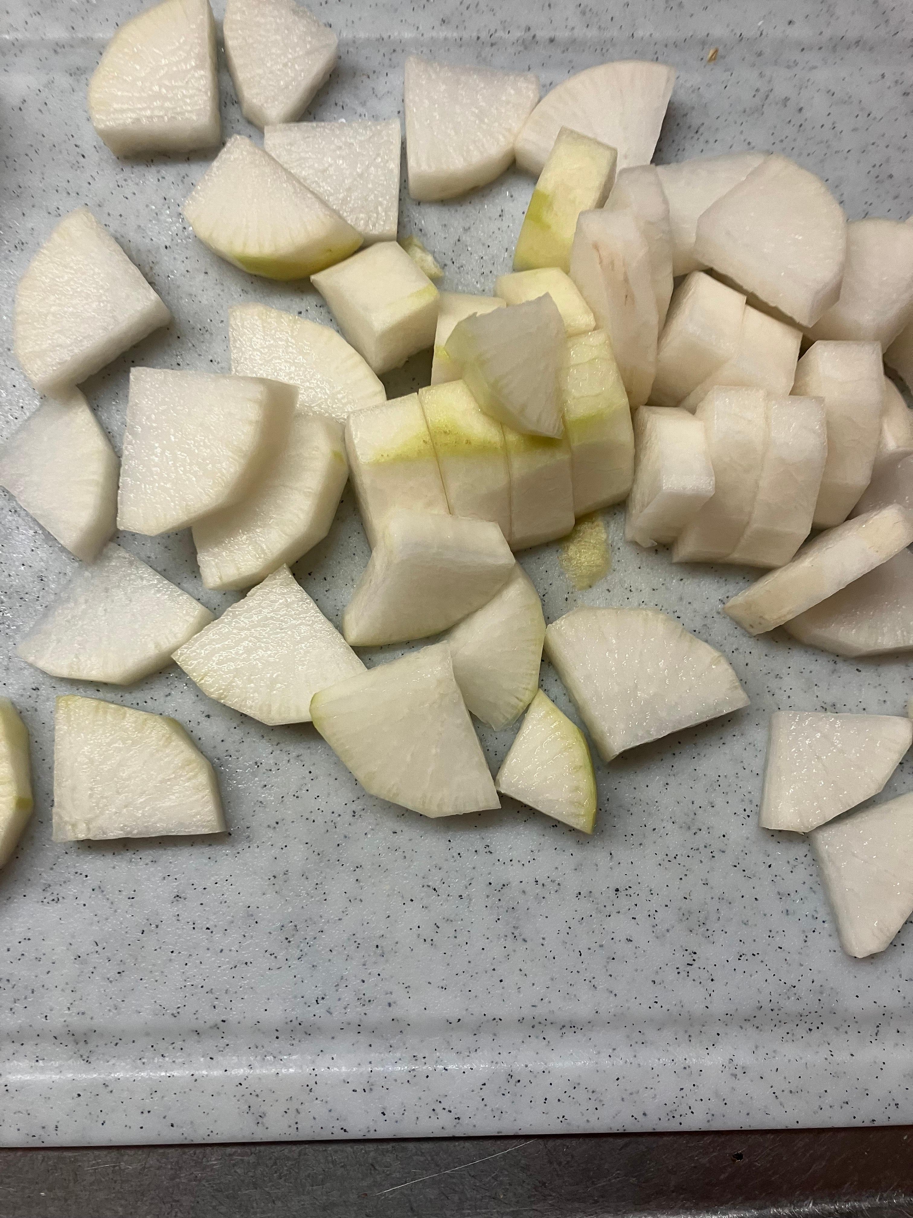 大根は皮を向き、薄くいちょう切りにする。ベーコンは少し大きめに切ります。