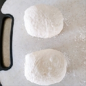 - 5 まな板に打ち粉(強力粉)をして、ボウルの生地をスプーンやスケッパーなどで剥がしながら取り出し、スケッパーや包丁で2等分する。