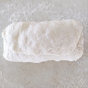 生地にも打ち粉をして上下から3つ折りにする。左右からも3つ折りにして、表面が張るようにまとめ、とじ目が下になるようにおく。