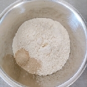 きび砂糖(砂糖)とドライイーストを隣りになるように加え、それとは離して塩を加える。