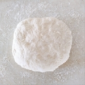 20分程経ったら、打ち粉をしたまな板に生地をひっくり返して(とじ目を上にして)おき、優しく押して中のガスを散らす。