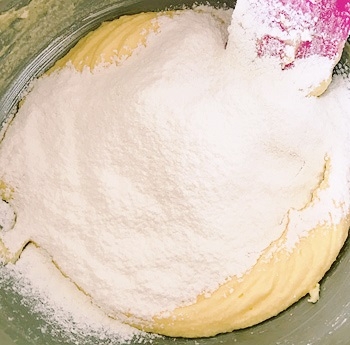 ゴムベラに持ち替えて、ふるっておいた粉類を加えて、粉けがなくなるまで切り混ぜる。