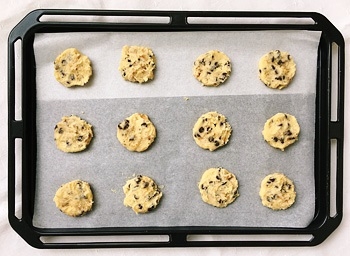 天板にオーブンシートを敷き、丸めた生地を間隔をあけて並べる。