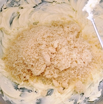 卵を溶きほぐし、2回にわけて加え、そのつど よく混ぜる。