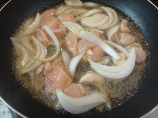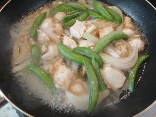 鶏肉に火が通ったら、凍ったままのスナップエンドウを加え、十分温める