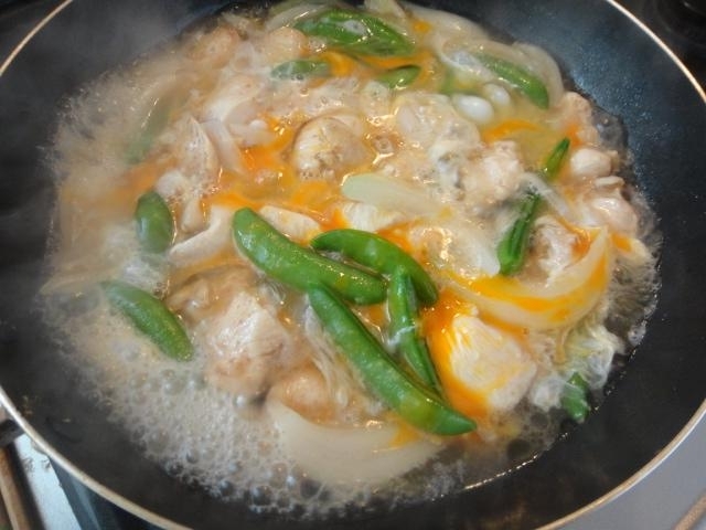 スナップエンドウと新玉ねぎ鶏むね肉の卵とじ レシピ・作り方