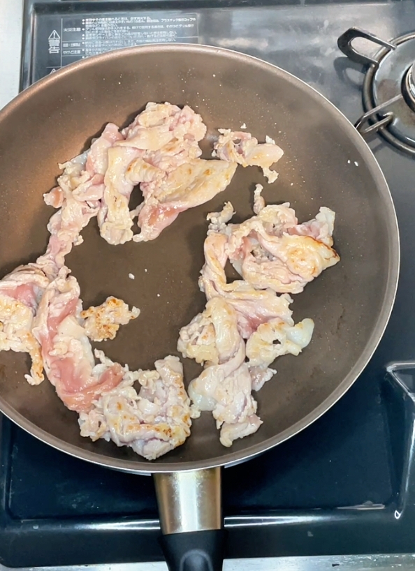 フライパンにごま油を熱し、豚こまを広げながら入れて、色が変わるまで炒める