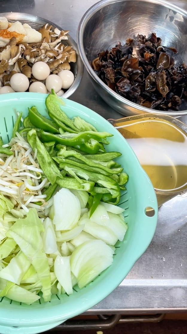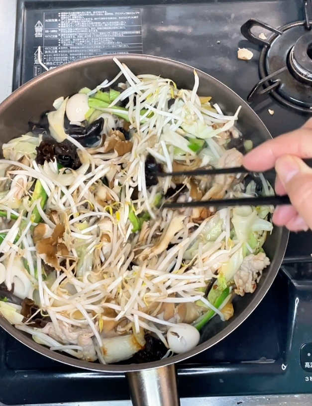 玉ねぎ→キャベツ→ピーマン・舞茸・キクラゲ→もやしの順で炒め、野菜に火が通ったら、ちくわとうずらの卵を入れる