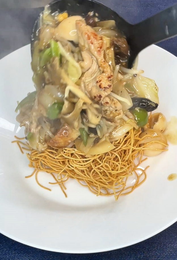 揚げ麺(皿うどん用)を皿に盛って、熱々の餡をかけて完成