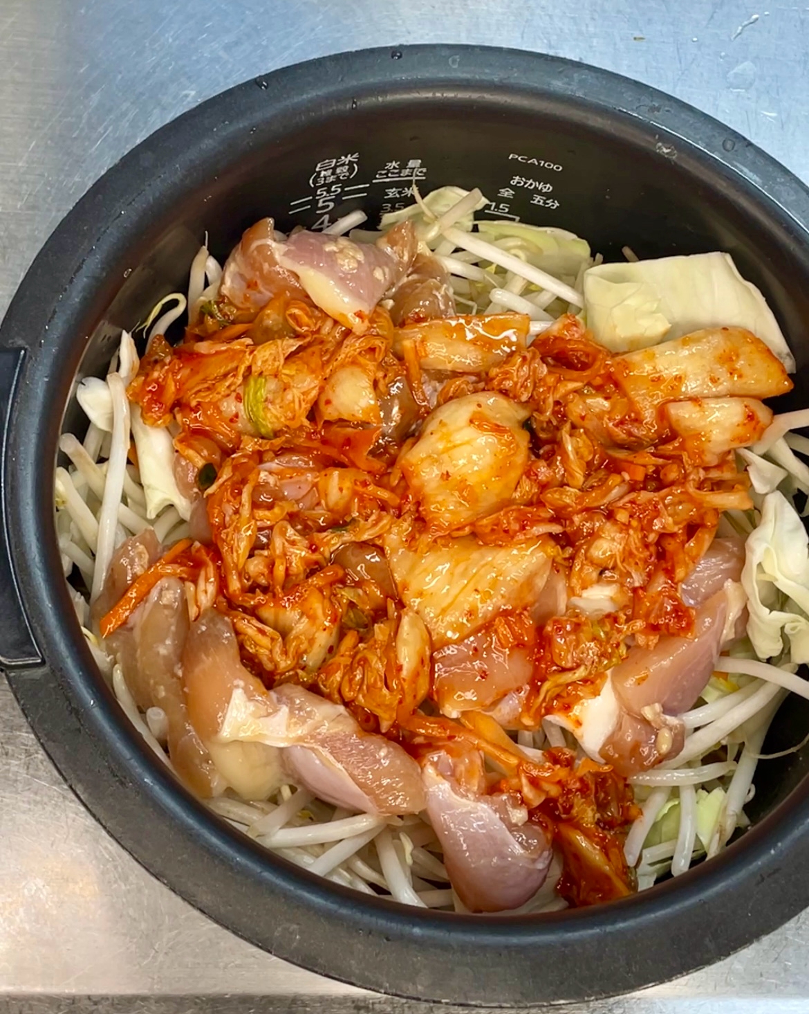 残りの材料を野菜ミックス→鶏肉→キムチの順に炊飯器に入れて通常炊飯する