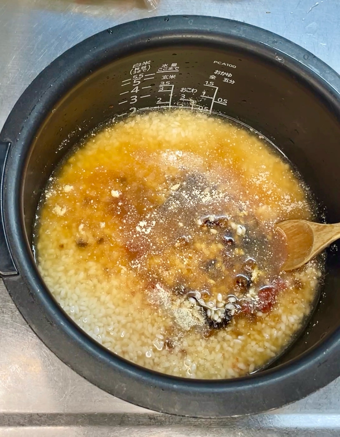 研いだ米と☆の調味料を入れて水を2合のメモリまで入れる