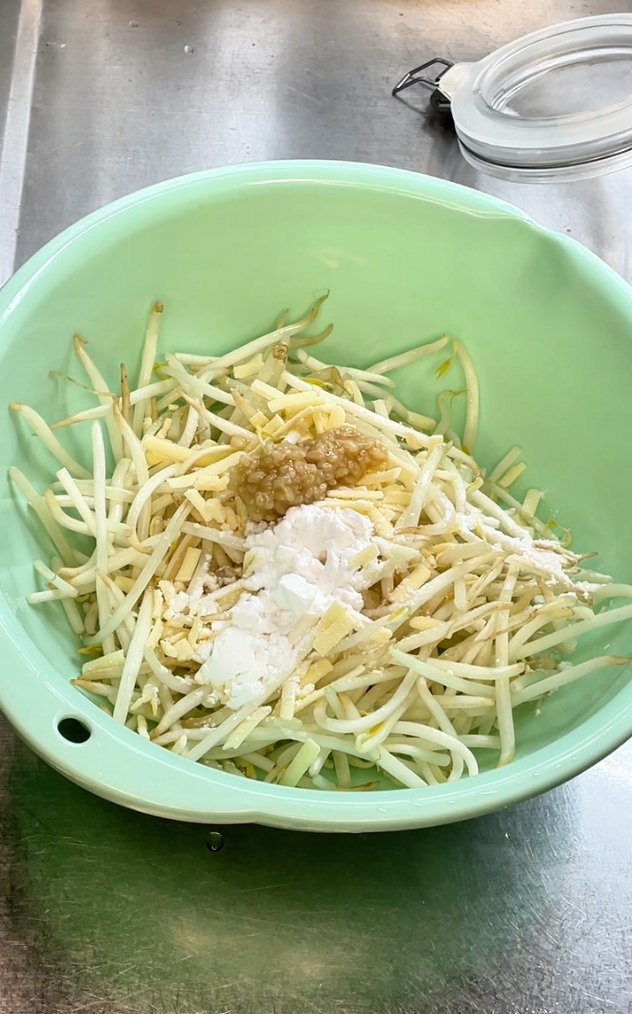 ボウルにもやし、チーズ、片栗粉、塩麹を入れてざっくり混ぜる
