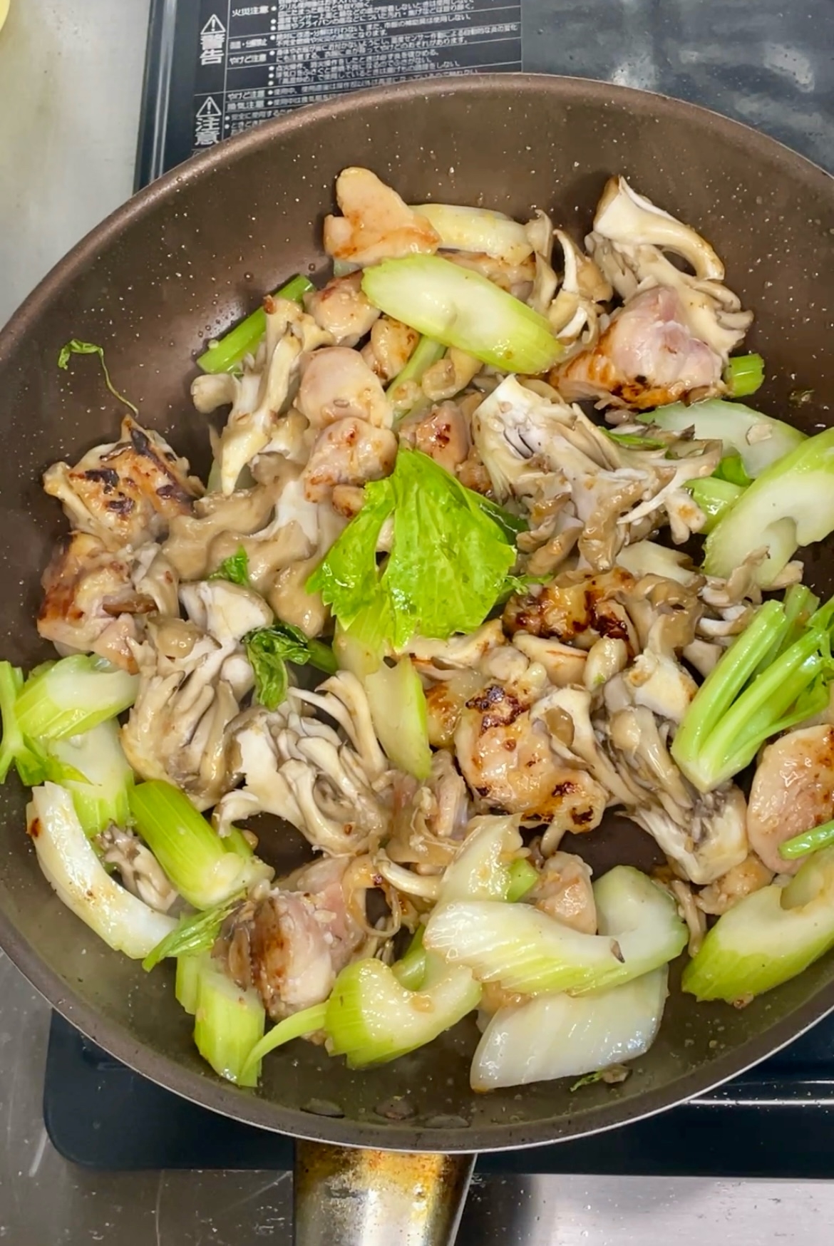 7割ほど火が通ったら、舞茸とセロリの茎を加えて炒める