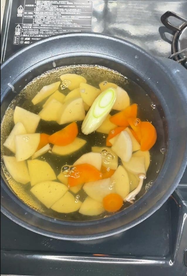 鍋にだし汁と鶏もも肉、大根、にんじん、ごぼう、長ねぎ、しめじを入れ、やわらかくなるまで煮る
