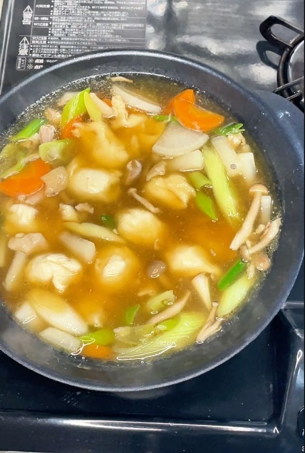 すいとんを指でちぎって加え、5分ほど煮て完成!