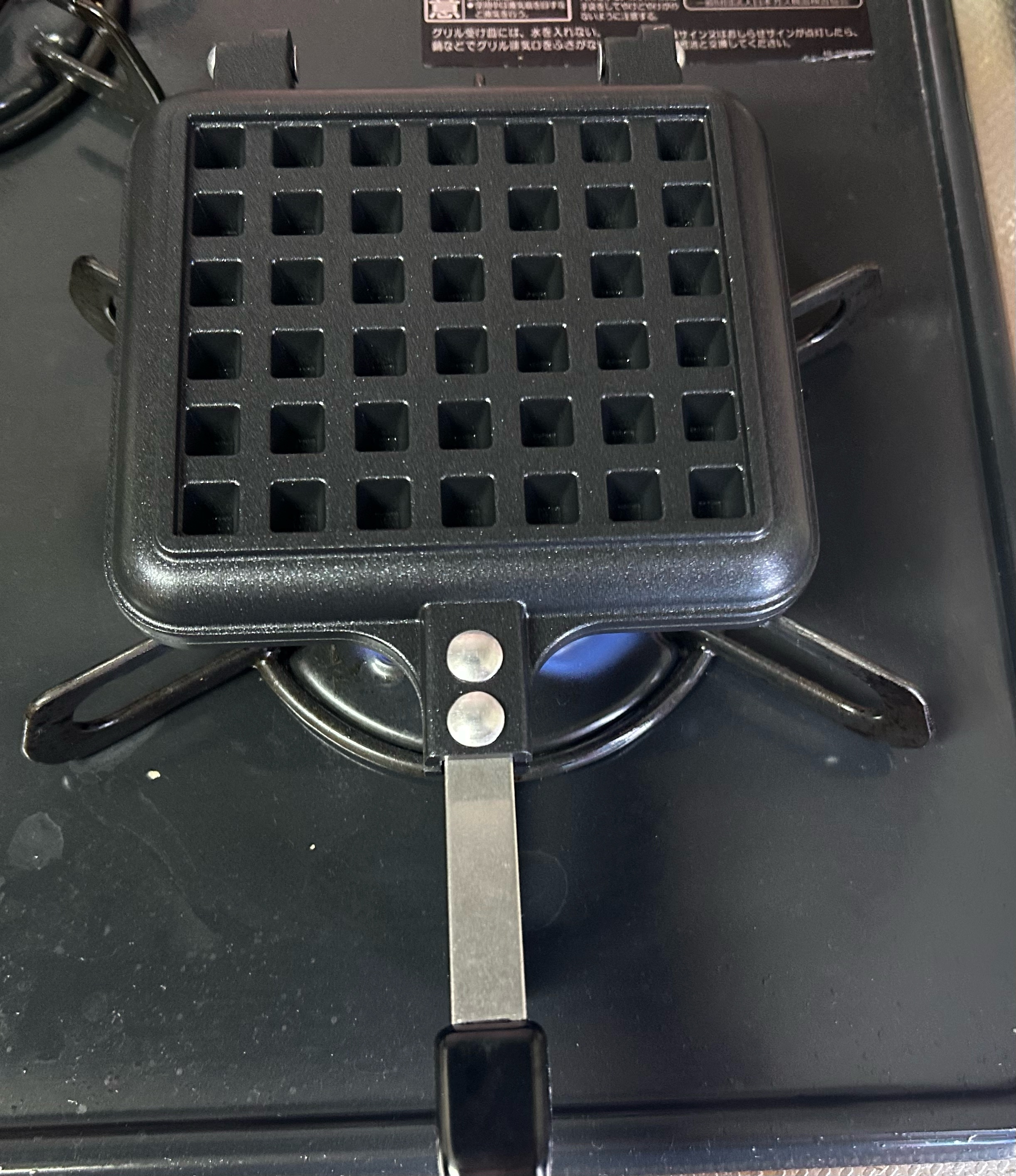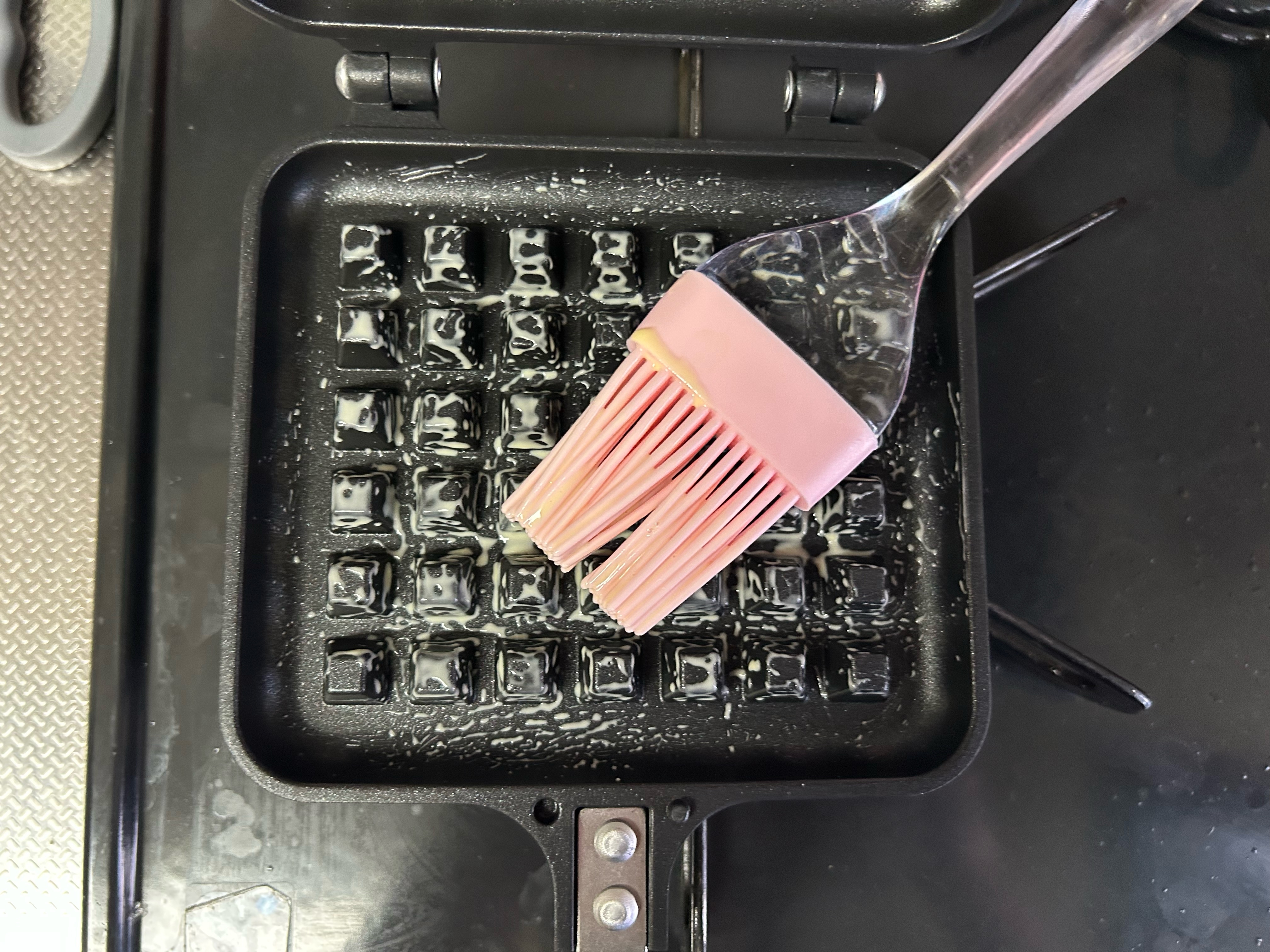 ワッフルメーカーを温めて、写真のようにハケを使って、塗り用バターを塗る。