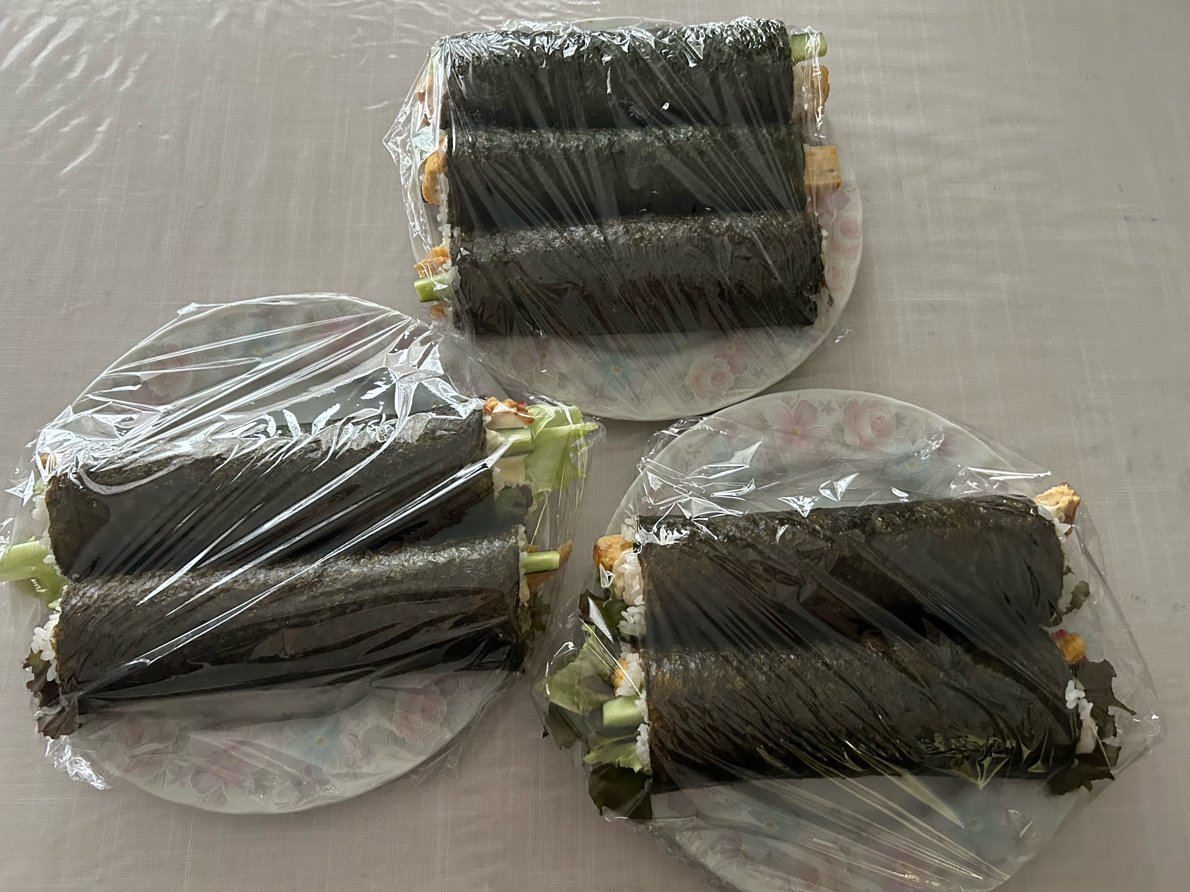 巻いたら皿にのせて海苔と馴染ませて、切りやすくする為に、しばらくラップなどをしておいておく。
