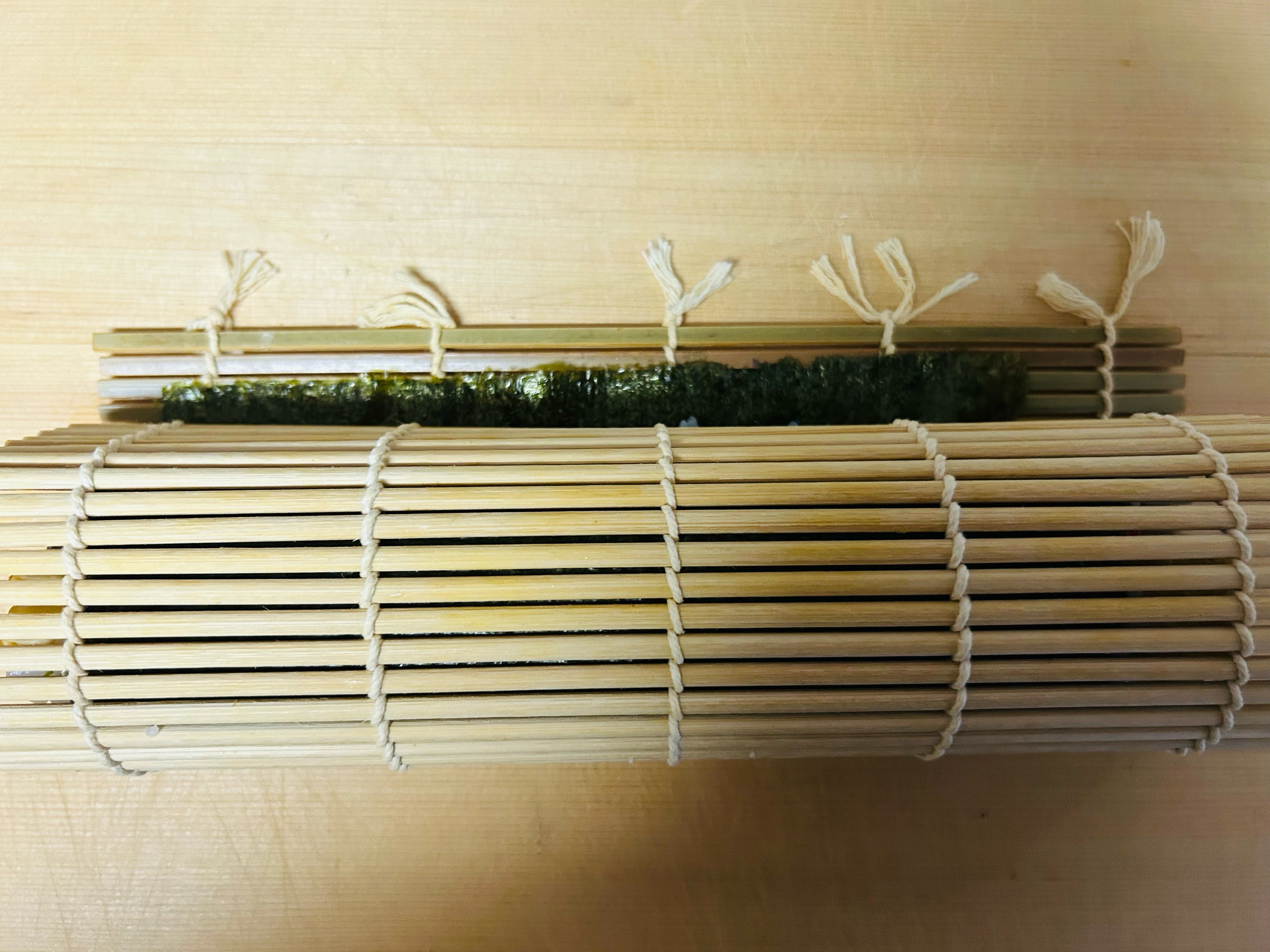 巻き簀を下から上に海苔2センチ見えるくらいに巻く。