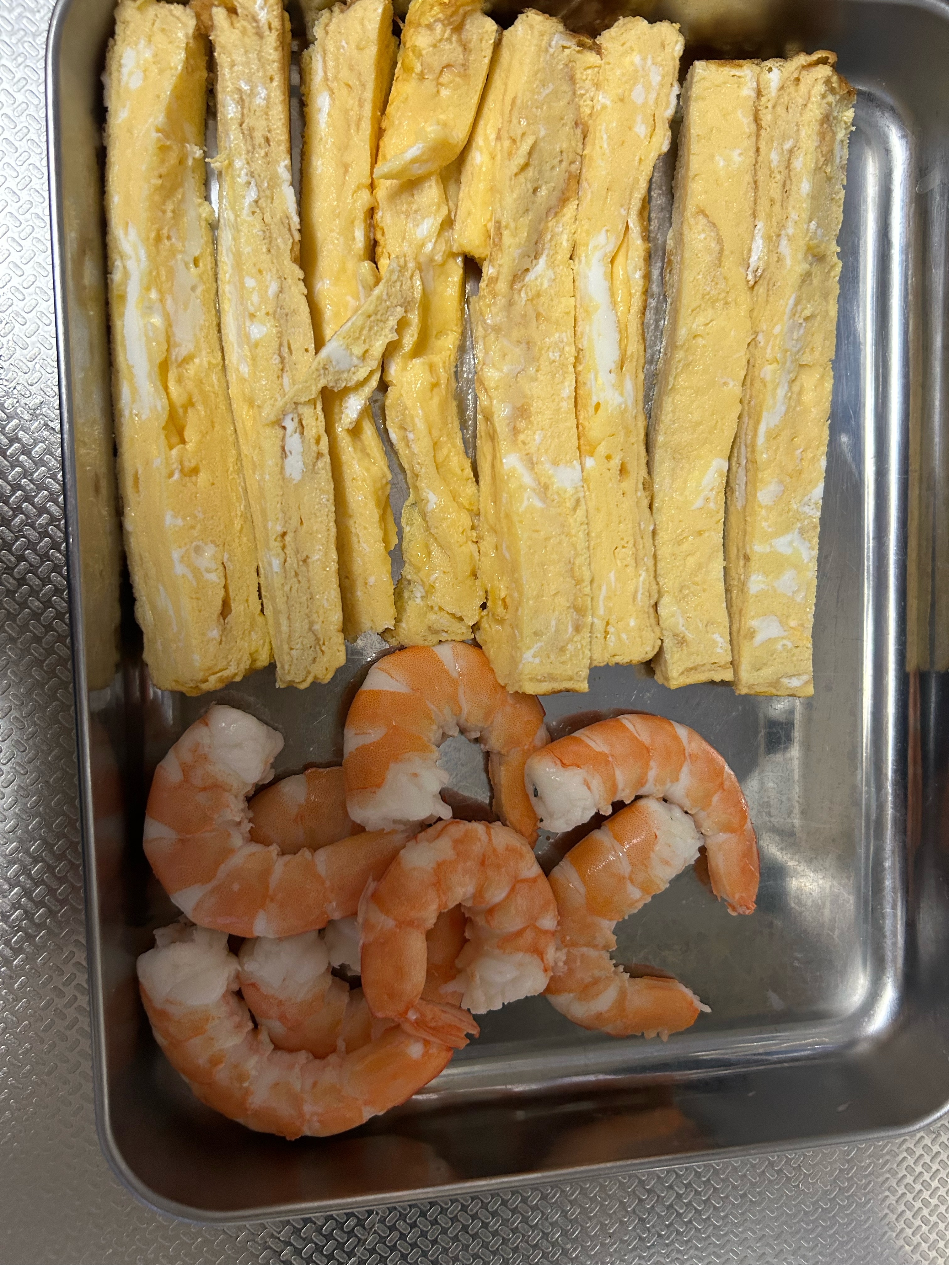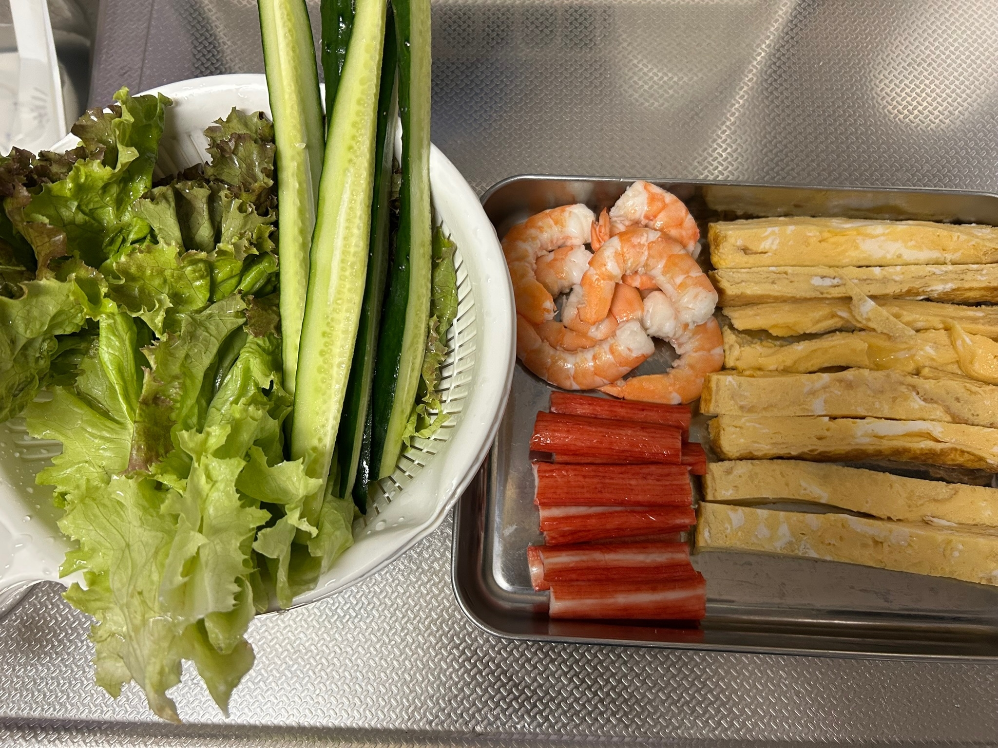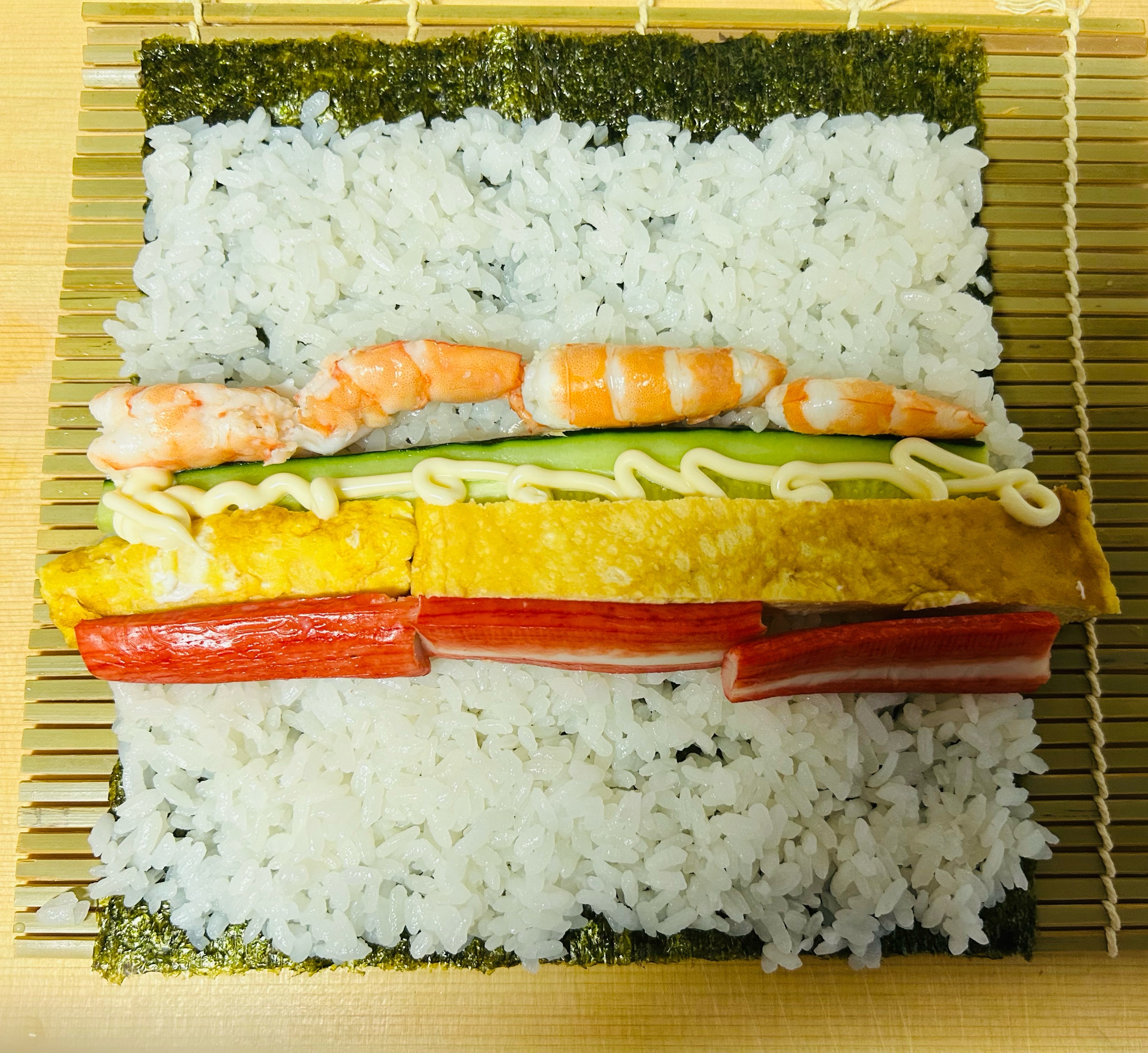 サラダ巻きは巻き簀に全形海苔、シャリを広げたらボイル海老、きゅうり、だし巻き卵、カニカマを写真のように並べてる。