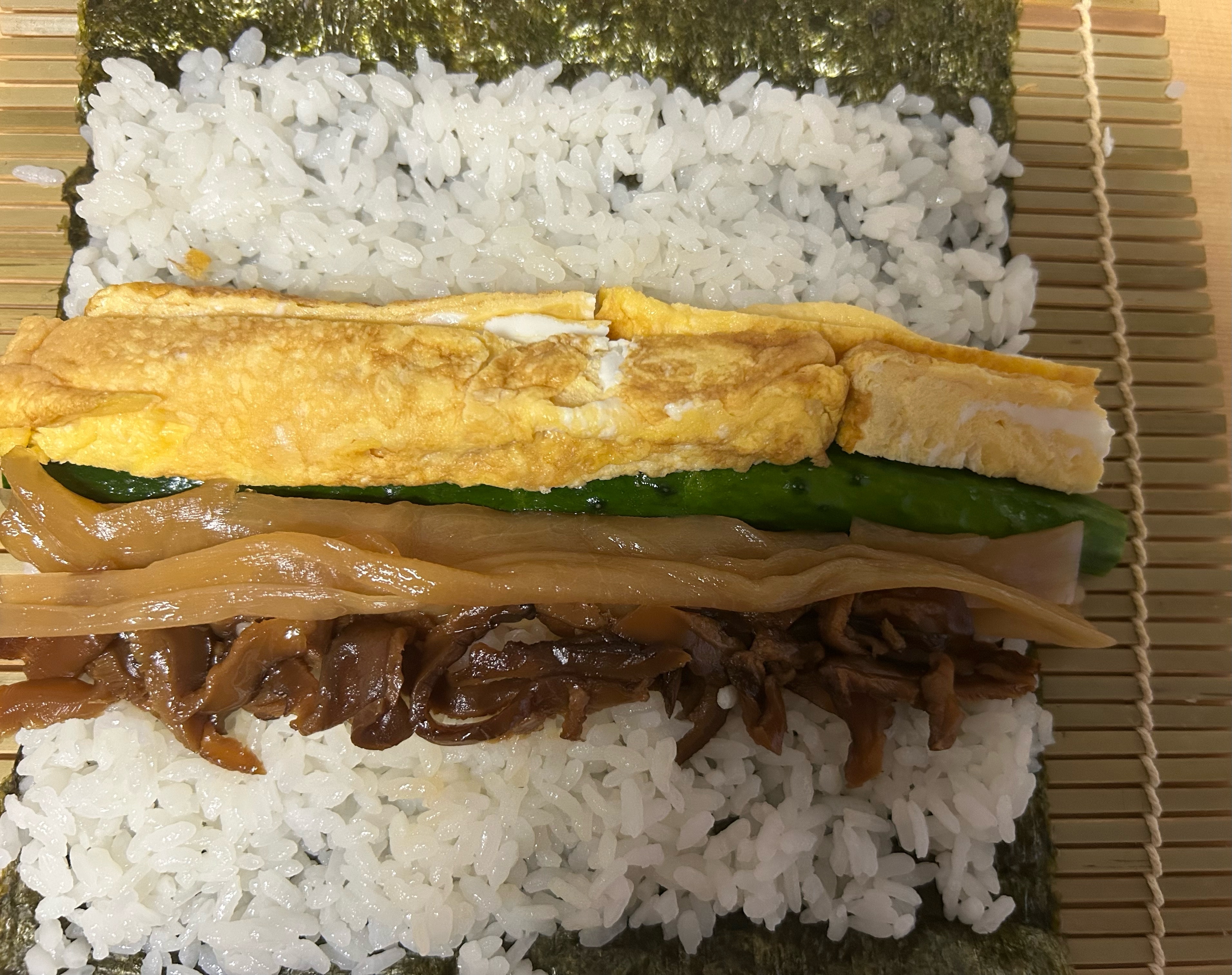 田舎巻きは最初にだし巻き卵をおき、きゅうり、かんぴょう、椎茸を写真のように並べる。