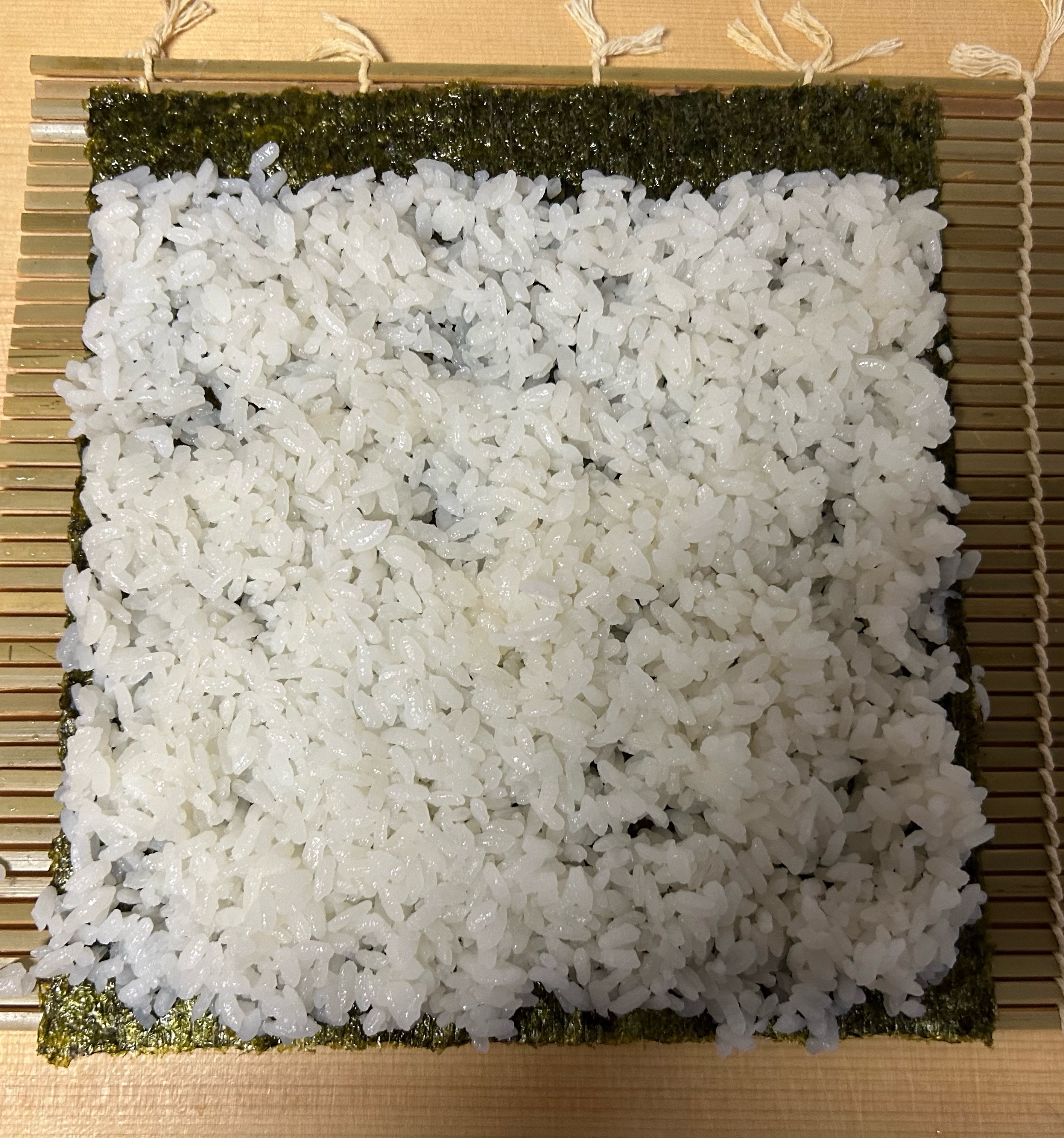 写真のように、巻き簀に全形海苔をひいて、上2センチくらいあけた場所から約200gのシャリを上から下に広げて、下は1センチ弱まで広げる。