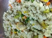 - 6 今回は、彩りアップでキュウリの塩もみとハムを入れています。