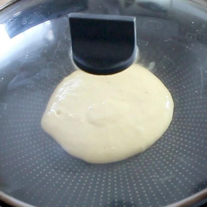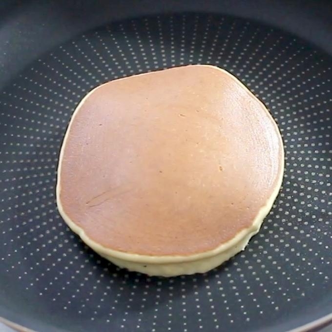 (小麦粉やホットケーキミックスのパンケーキほどぷくぷくしないので少しめくって焼き色がついていればOKです)