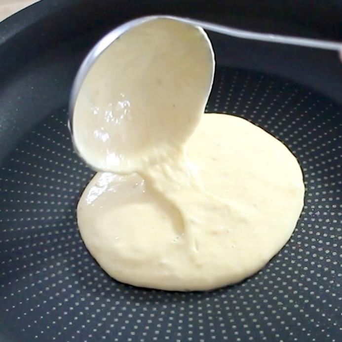 おたま1杯ずつで直径12センチくらいのパンケーキが2枚焼けます。