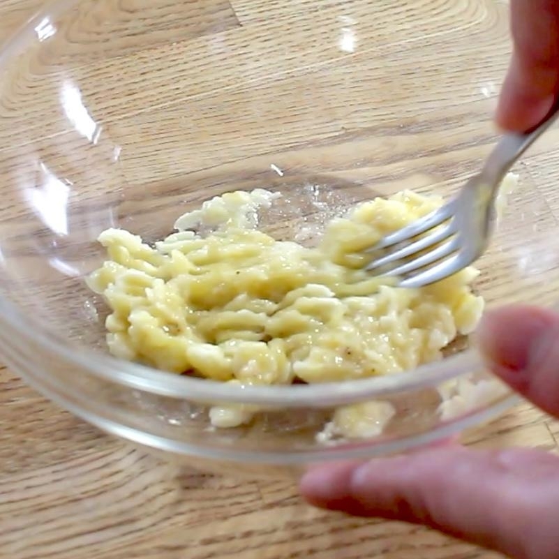 卵を入れてバナナの粒がなくなるようにしっかり混ぜます。