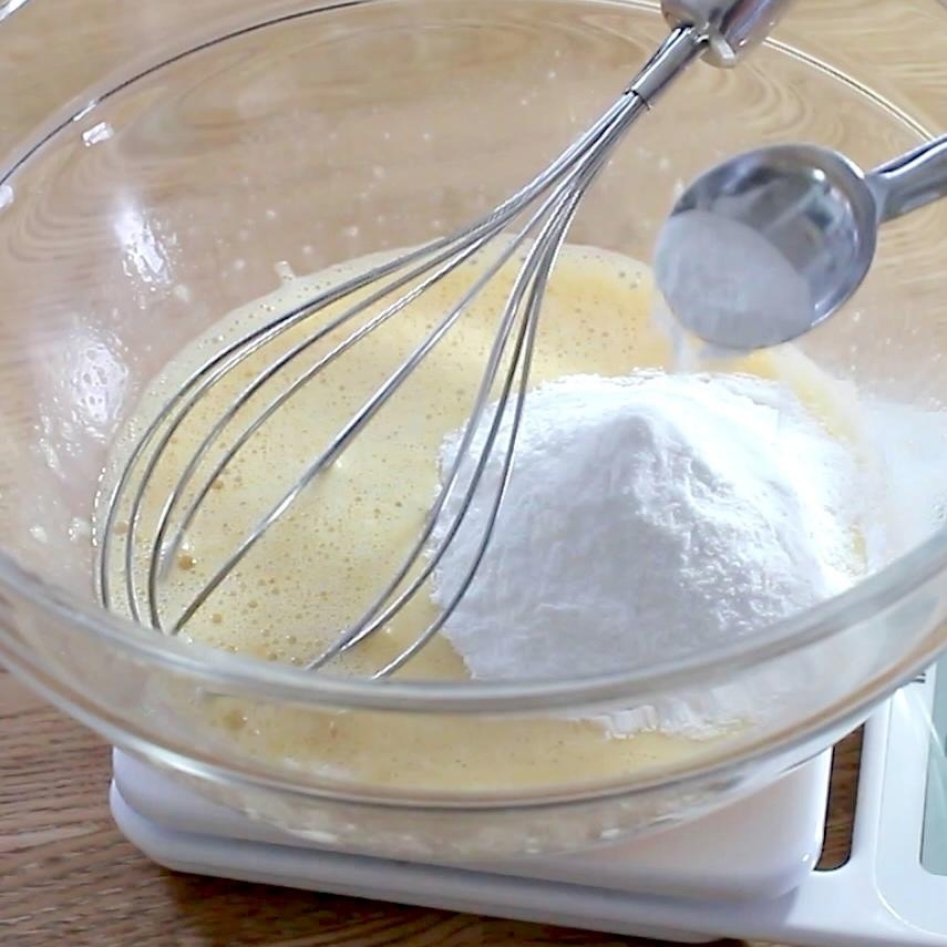 米粉とベーキングパウダーを入れてよく混ぜます。
