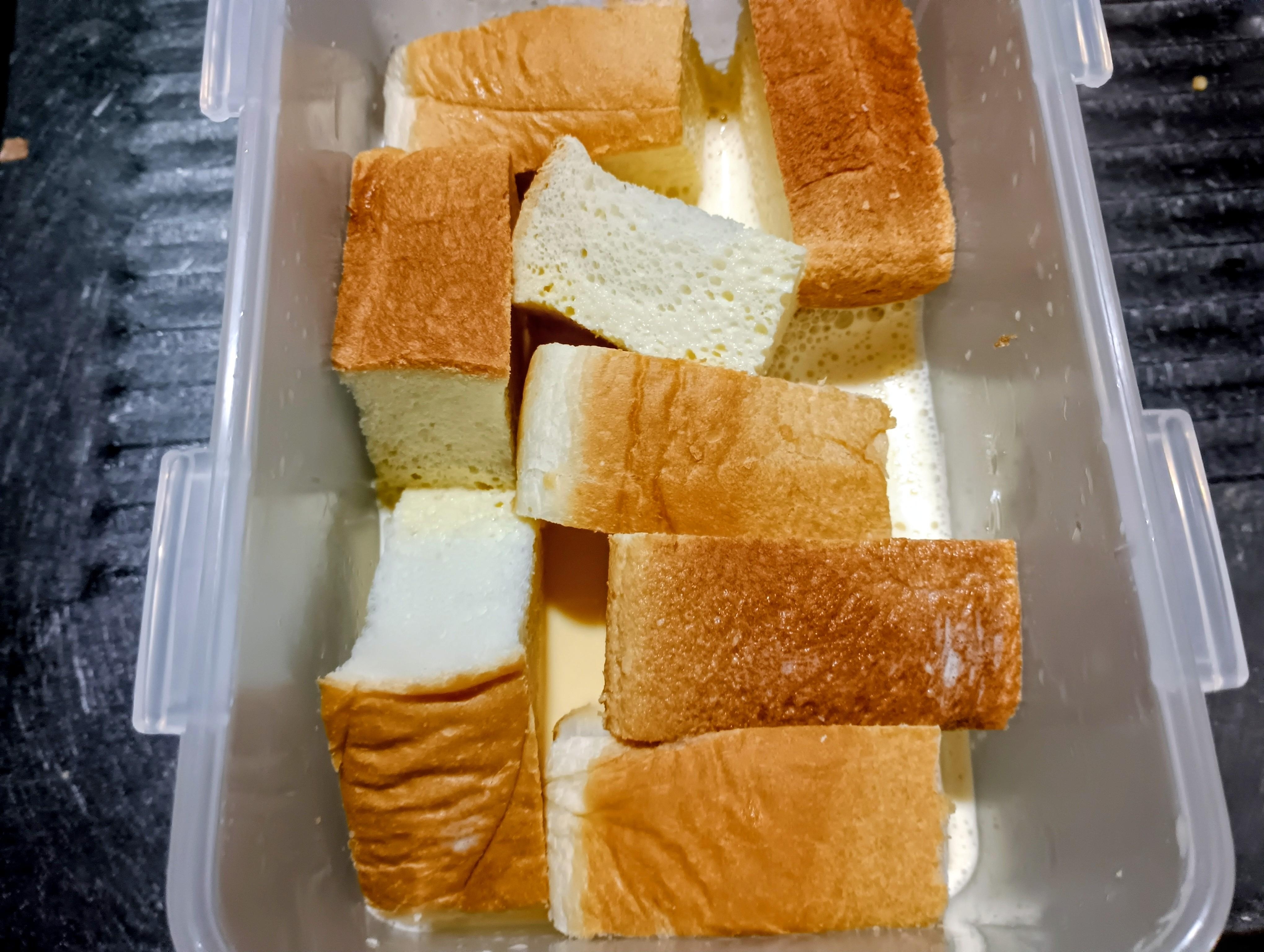 4つ切りにした食パンを入れて蓋をして全方向にゆっくりと回して全体が浸るようにします。