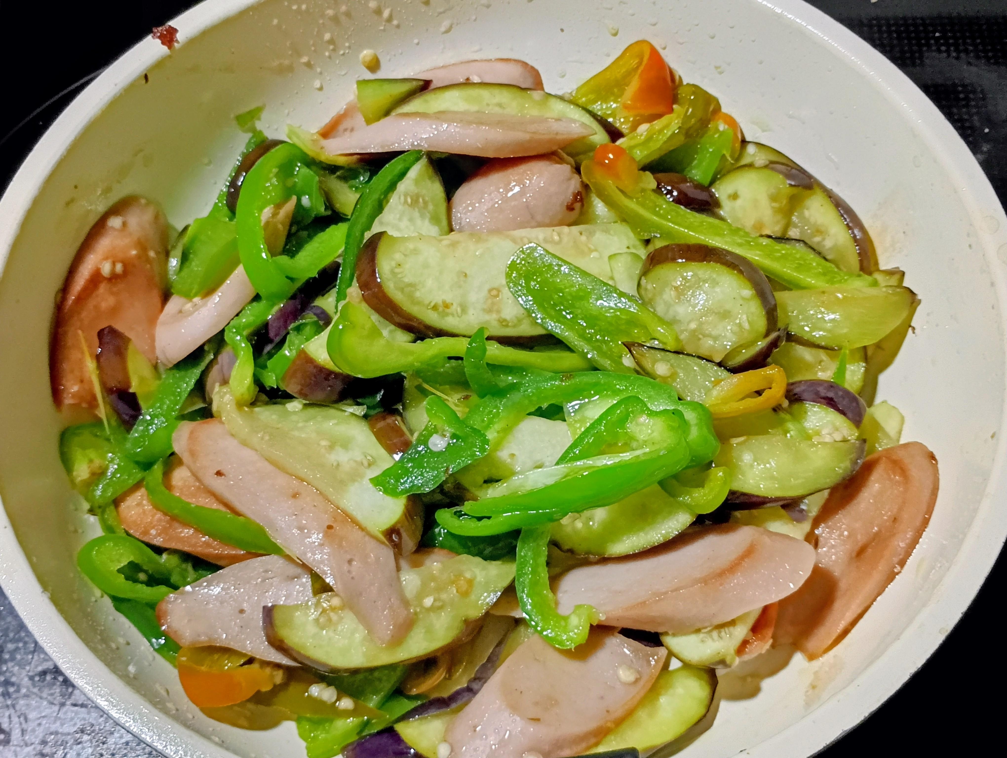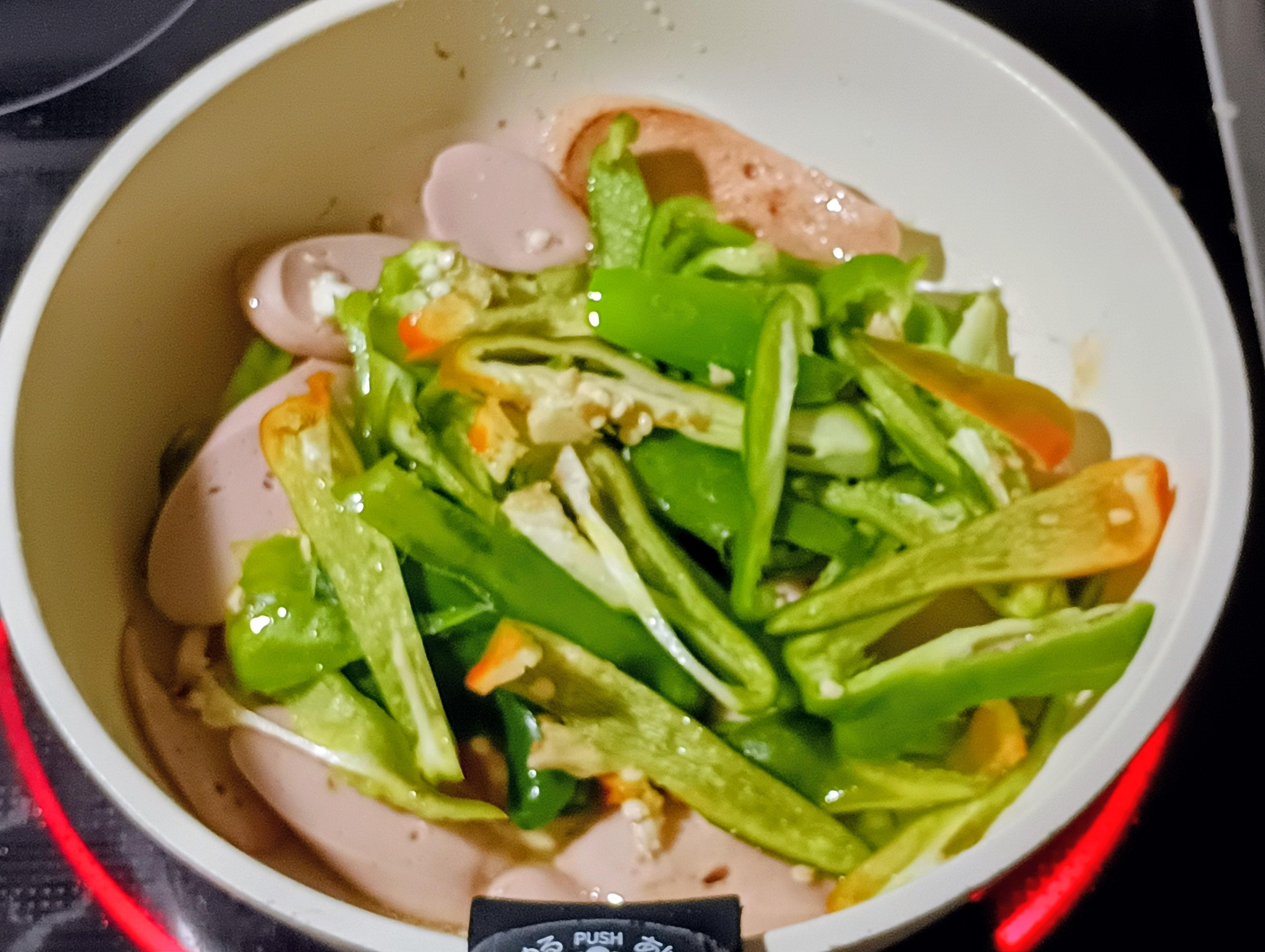 魚肉ソーセージに焼き目が付いたら細切りにしたピーマンを加えて炒め合わせます。