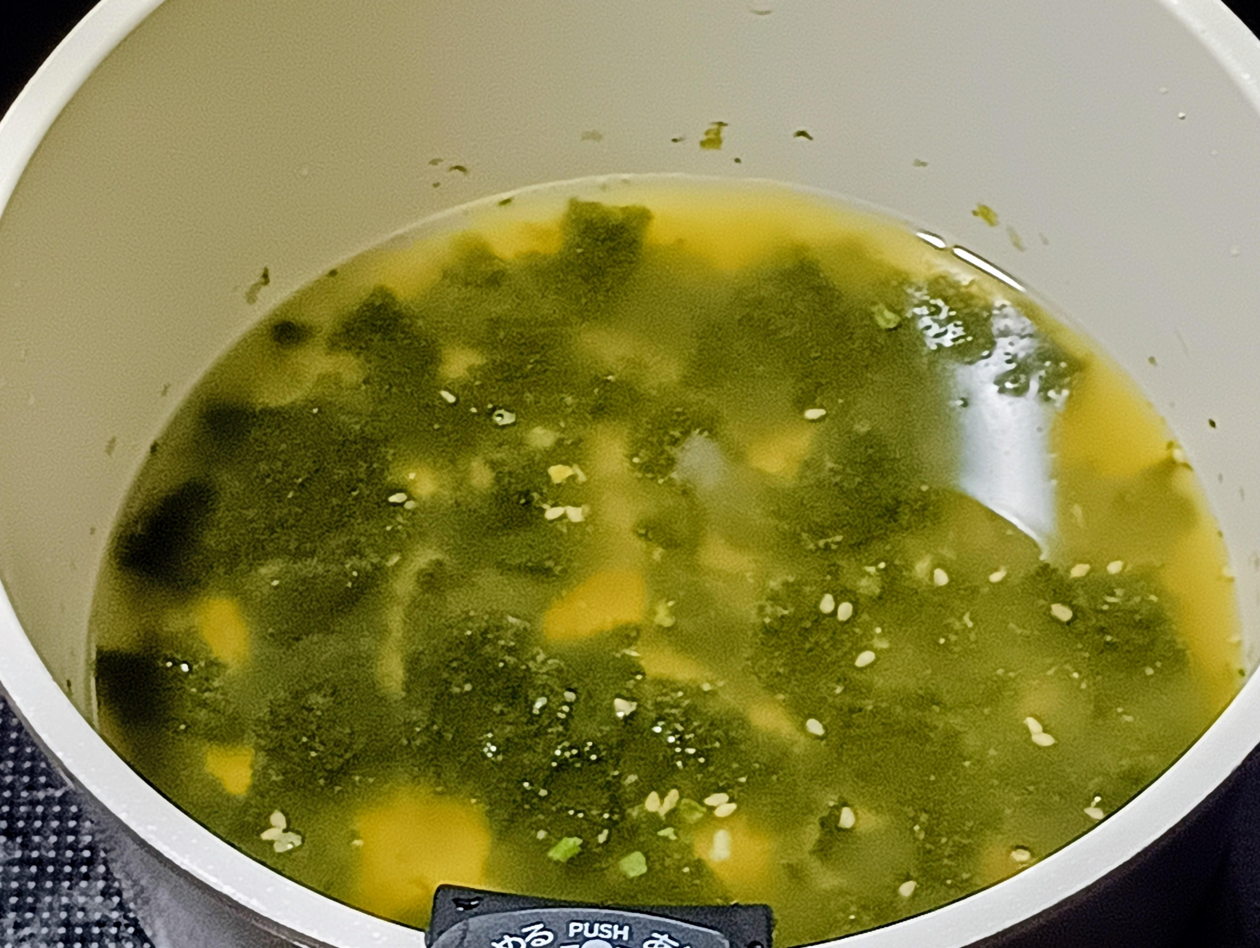 沸いたら手で小さくちぎった焼き海苔とインスタントの塩ラーメンの粉末スープを入れてよく混ぜ合わせます。