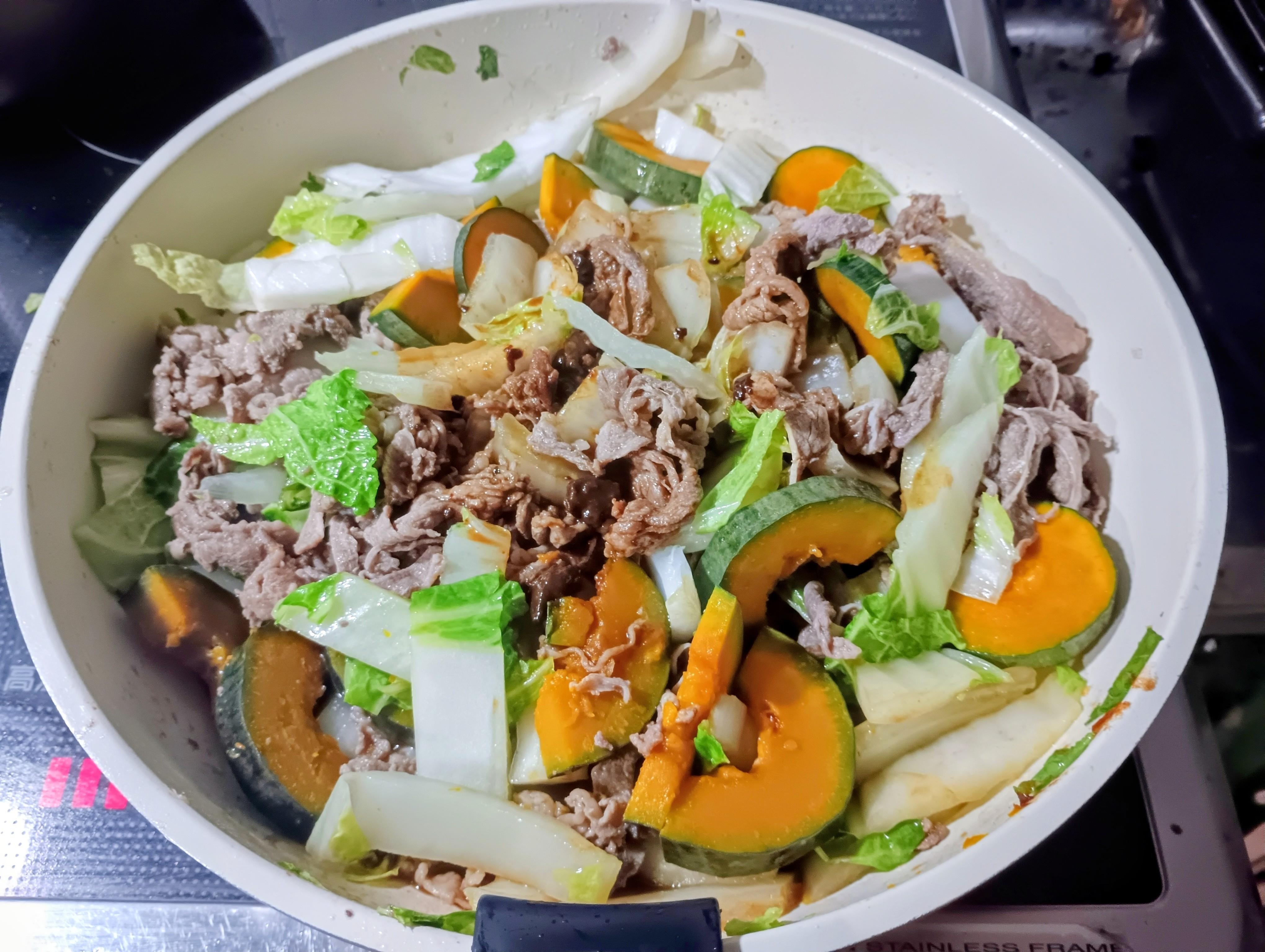 牛こま肉に火が通ったらかぼちゃを加えて炒め合わせます。