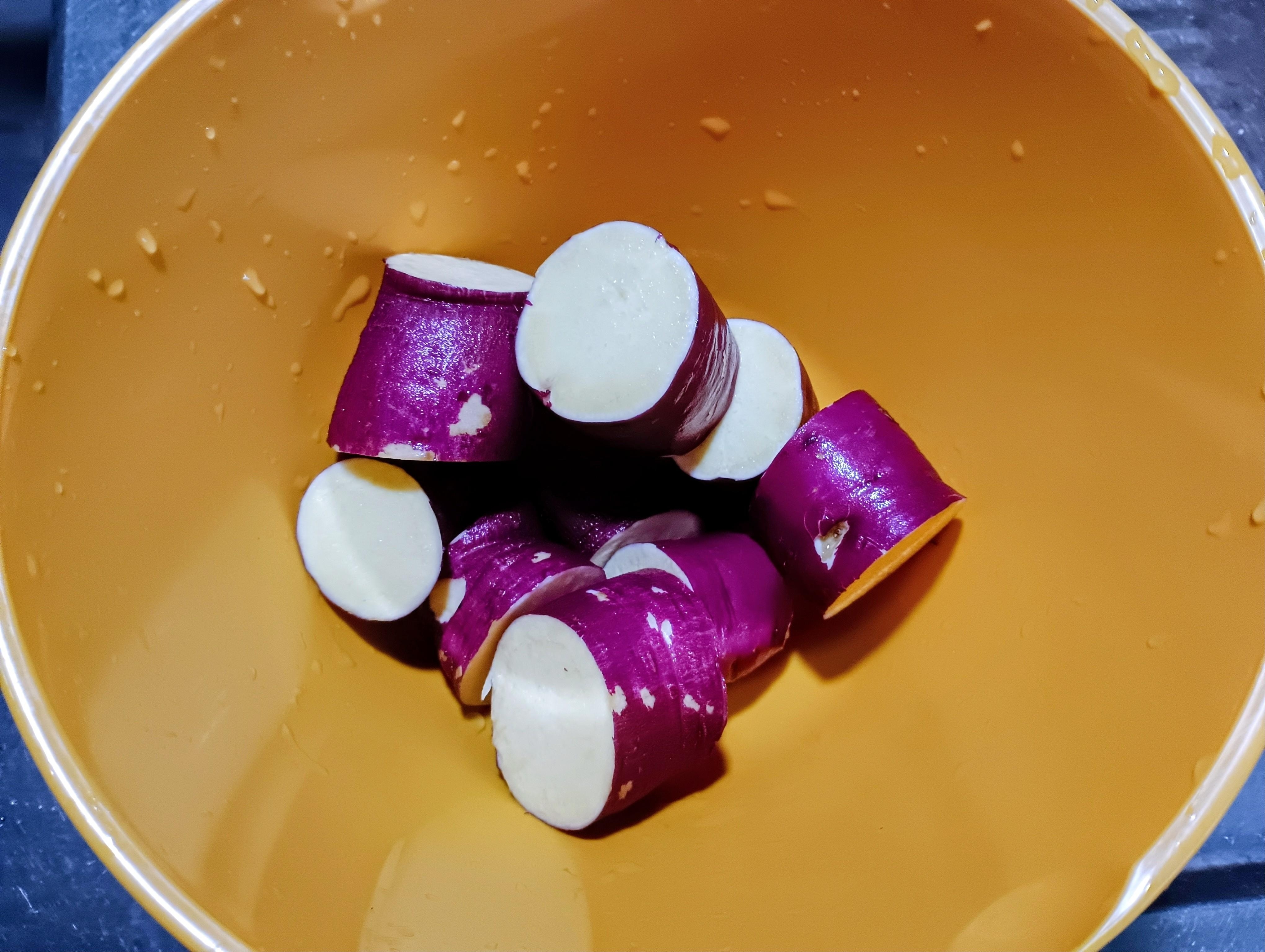 レンジ可の耐熱ボウルに綺麗に洗ってひと口大のサイズにぶつ切りにしたさつま芋を入れます。