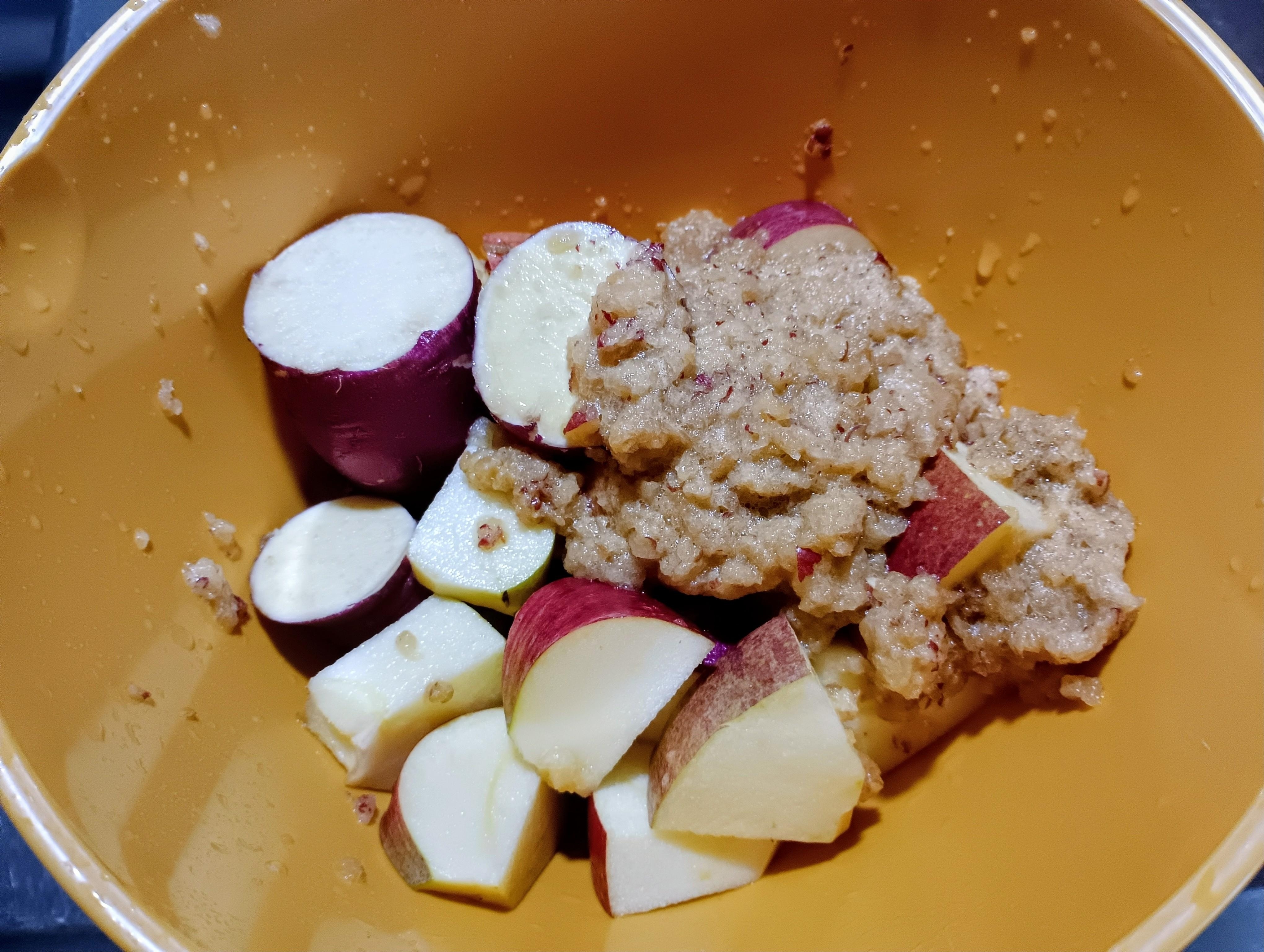 分量や味付けはお好みで自由に調整しても良いですが、さつま芋200g、りんご200g、甘酒50cc、だし入り味噌小さじ1の割合が黄金比で1番美味しく出来ると私は思っています。 レンジ加熱の時間は適宜調整して下さい。